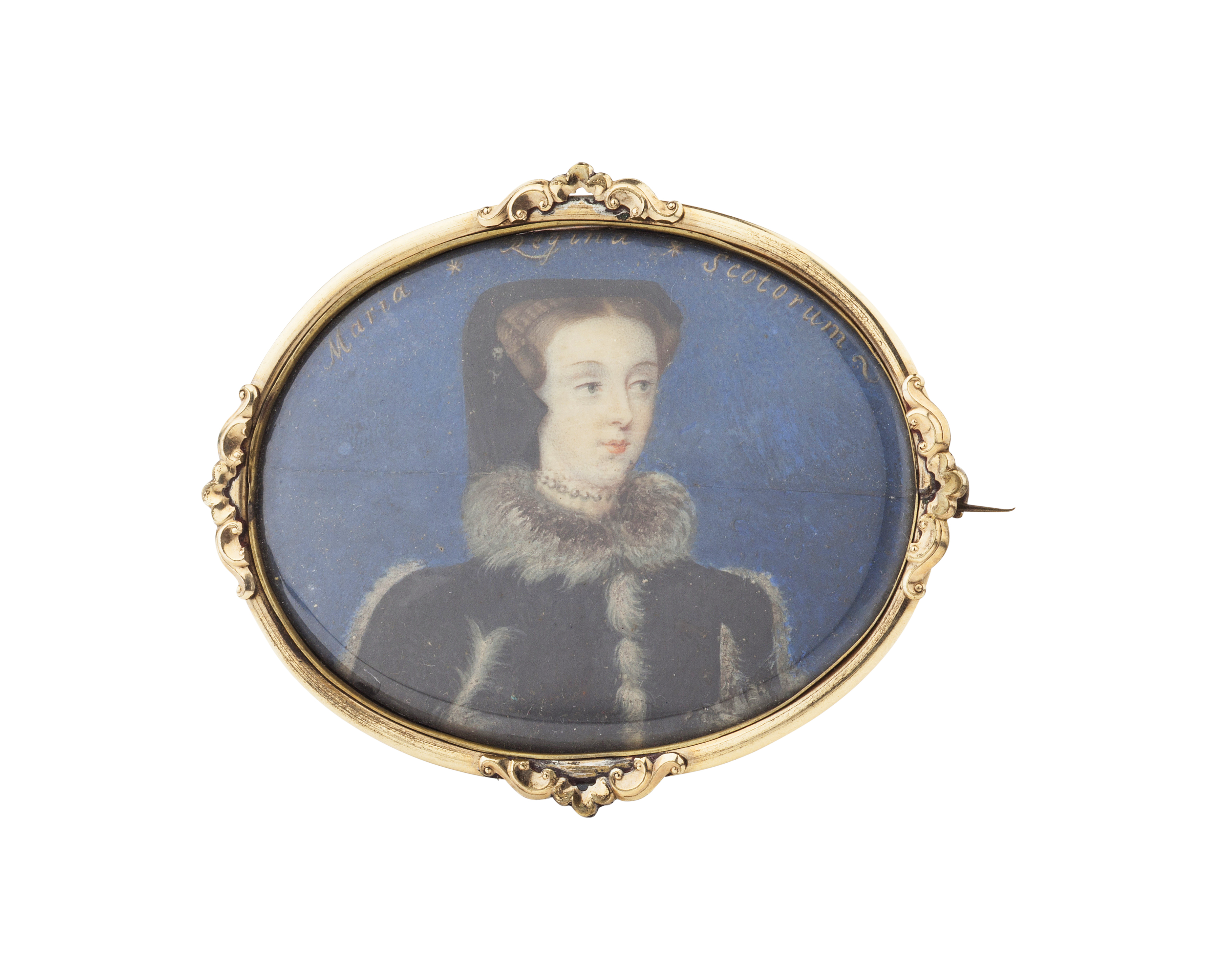 unsigned, the oval ivory plaque with blue ground and bust of Mary Queen of Scots, named above 'Maria * Regina * 8 Scotorum', in later gilt metal frame with brooch fitting