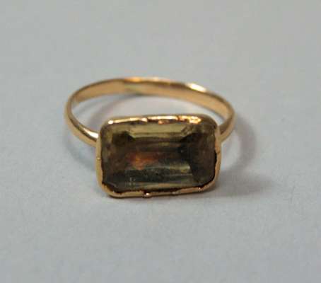 the gold ring of traditional form with simple shank and closed back setting engraved with indistinct initials, set with a rectangular facetted citrine; together with a small fragment of tartan pinned to an envelope and a two page (four sided) hand written letter detailing provenance and family descent of the ring and tartan, dated 1927
