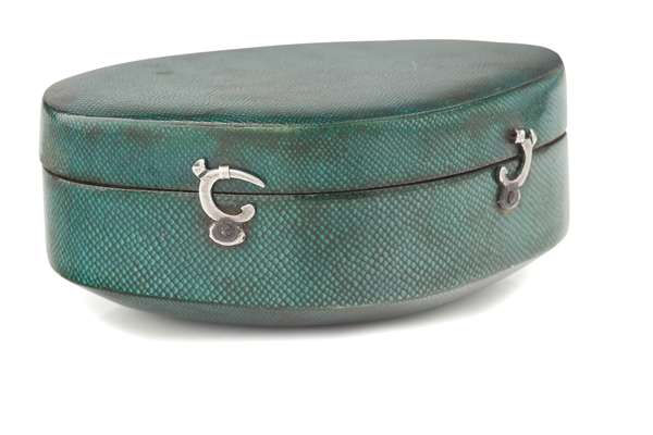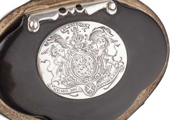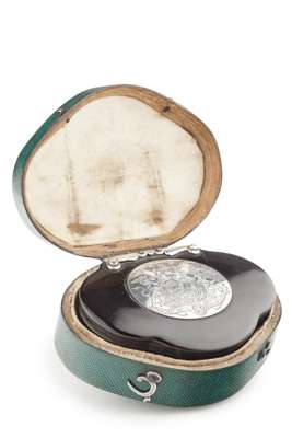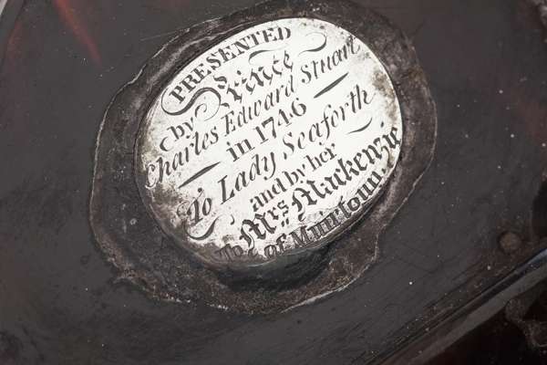the trefoil tortoiseshell box with silver butterfly hinge and applied plaque engraved with the Royal arms of Scotland, the inside cover with applied plaque inscribed' Presented by Prince Charles Edward Stuart in 1746 to Lady Seaforth and by her to Mrs Mackenzie of Muirton', in a fitted dyed fish skin case with silver hinged and clasps