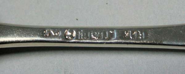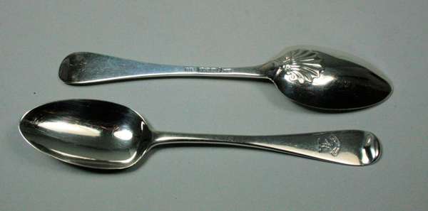 retailed by A Murray of Dundee, made by A Wilkie Edinburgh 1828. of old English pattern with engraved crest and motto to obverse of terminal, the back of the bowl with shell heel (4)