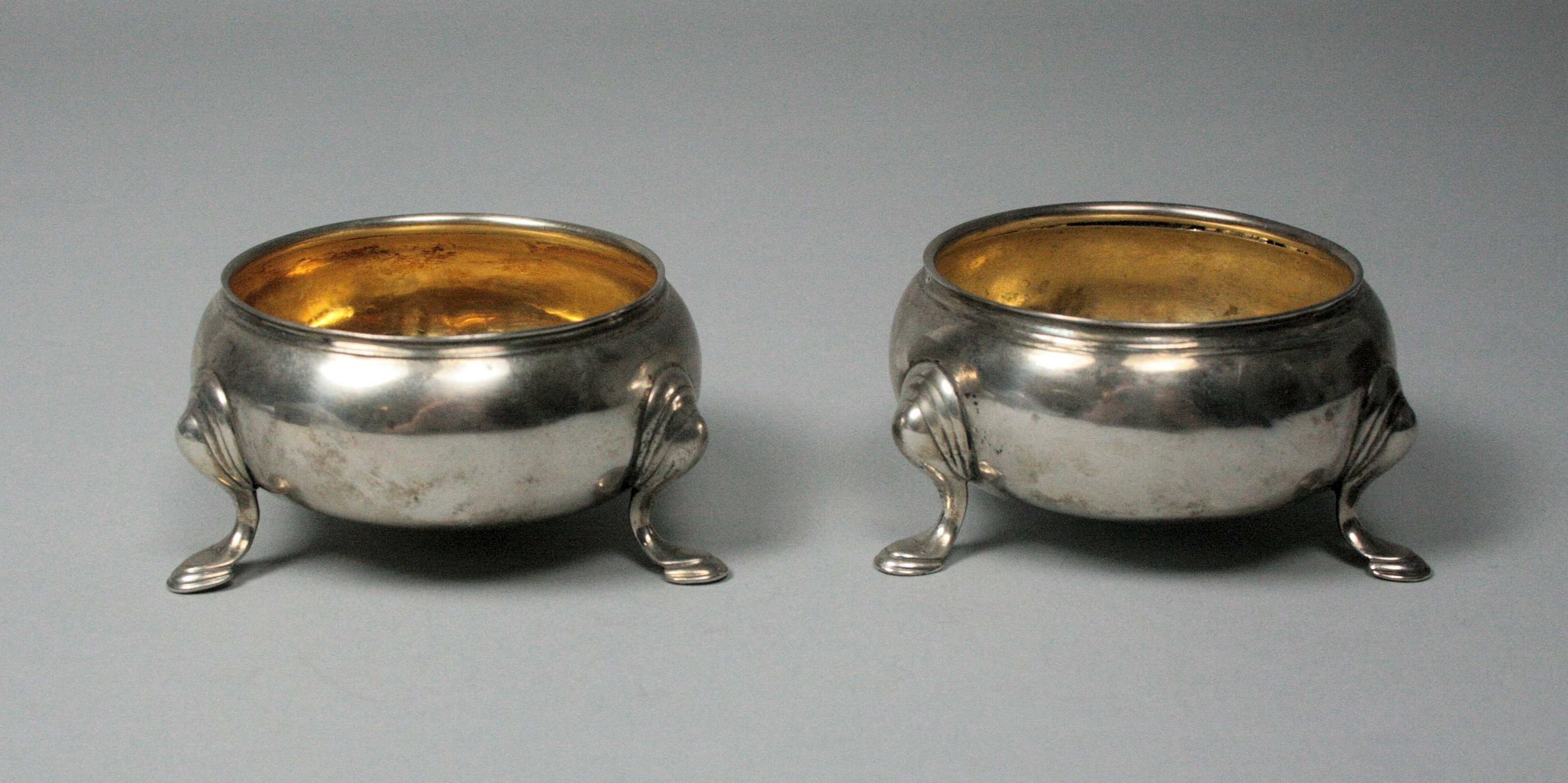 James Glen, marked GLN, town mark, GLN, S, of simple baluster form with slightly everted rim, raised on three stepped hoof feet (2)