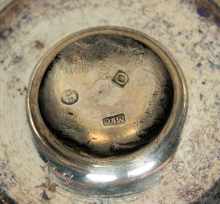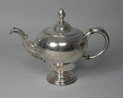 Milne & Campbell, marked M&C, town mark, O, of inverted pear shape d with engraved rim and floral pendant swags, the domed hinged cover similar decorated with bud finials, short fluted spout and leaf capped C scroll handle