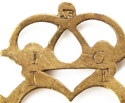 Alexander Stewart, marked AS twice, of conventional open work form with heart outline and spectacle detail surmounting, with engraved details and swing pin, the reverse engraved 'IC / IF'
