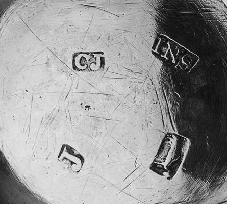Charles Jamieson, marked CJ, INS, camel, J, the plain shallow bowl with twin shaped lugs engraved 'AMR' and J*J', raised on a simple collet foot
