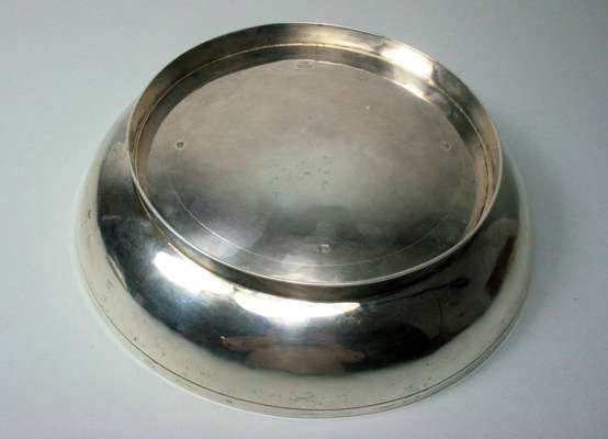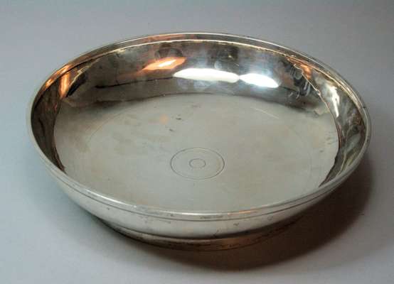 Brook & Sons, Edinburgh 1938, then shallow circular bowl of simple plain form with engraved circular boss to centre an raise on a collet foot