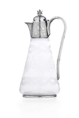 Hamilton & Inches, Edinburgh 1875, the flared class body with engraved borders and interlaced floral garlands and displays, the silver neck and spout with engraved birds within trees on a textured background, the hinged lid with cast finials, with C scroll bamboo formed silver handle