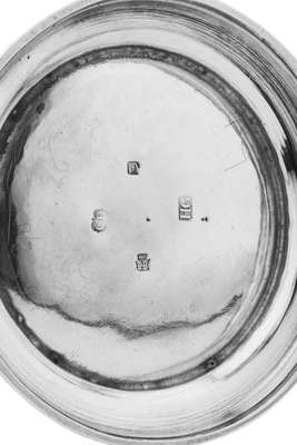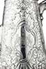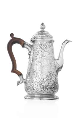 Charles Dickson, (of Dundee and Edinburgh), Edinburgh 1749, the slight baluster body with profusely chased foliate and rococo scrolls, floral garlands and pendants, the scroll formed twin cartouches with engraved armorial, slender 'S' scroll spout with leaf capped detail, the domed cover with pine cone finial and chased border, with 'S' scroll fruit wood handle