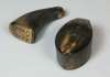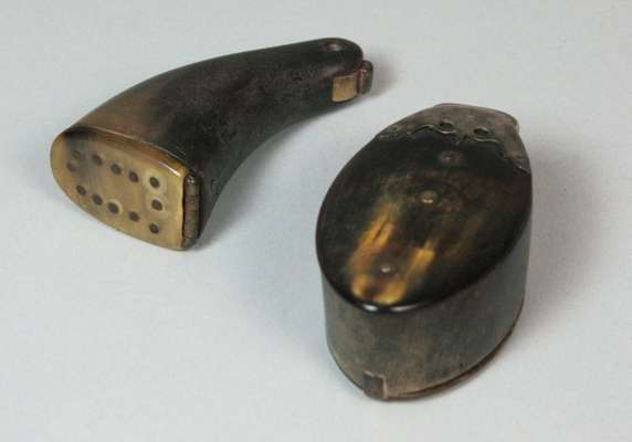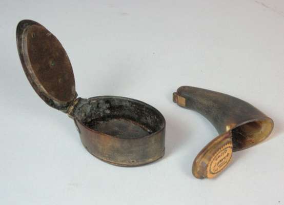 unmarked, of navette form with horn sides, base and hinged cover, applied butterfly hinge; together with a small horn snuff mull, of flattened form with measure to base (2)