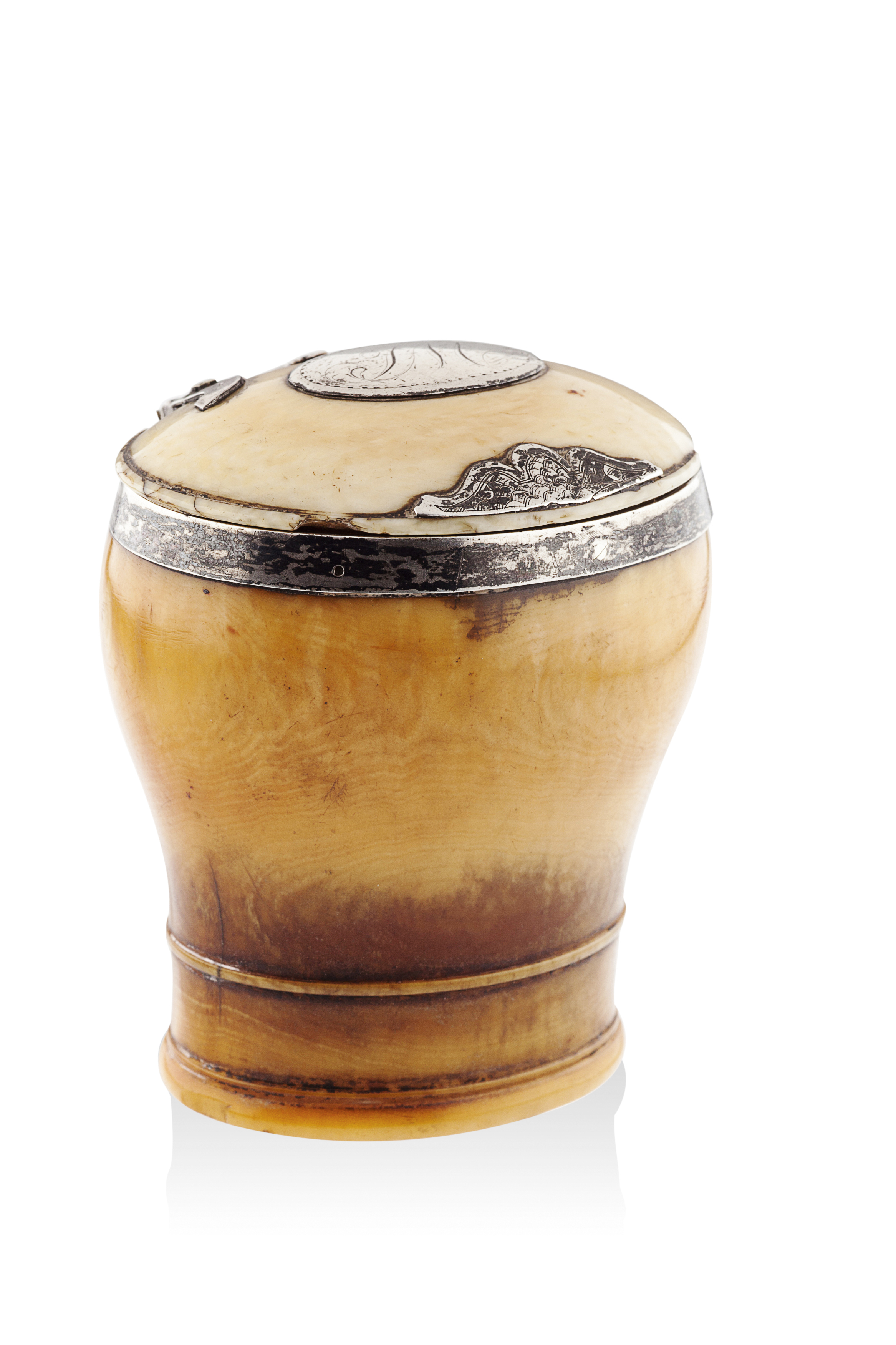 the inverted baluster body with simple girdle and applied collar rim, with engraved thin buttlerfly hinged and thumbpiece set to domed ivory cover, with oval cartouche engraved with initials 'JH'