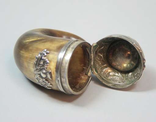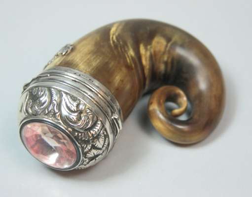 unmarked, the well coiled horn with applied thistle and reeded rim, the hinged domed cover with chased scrolling decoration and centrally set foil backed crystal