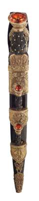 by William Anderson & Sons of Edinburgh, the brass mounts with traces of gilding, the carved baluster handle with basket weave and brass studded decoration with thistle mount to pommel containing foil backed crystal, the leather covered scabbard with brass mounts, with thistle and regimental decoration, with en suite bi-knife and fork, with plain single fullered blade; together with bullion and velvet dirk frog (2)
