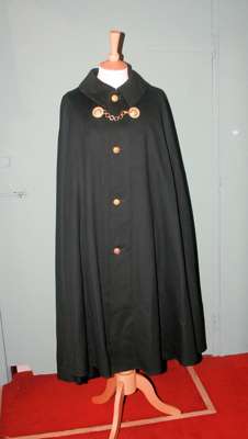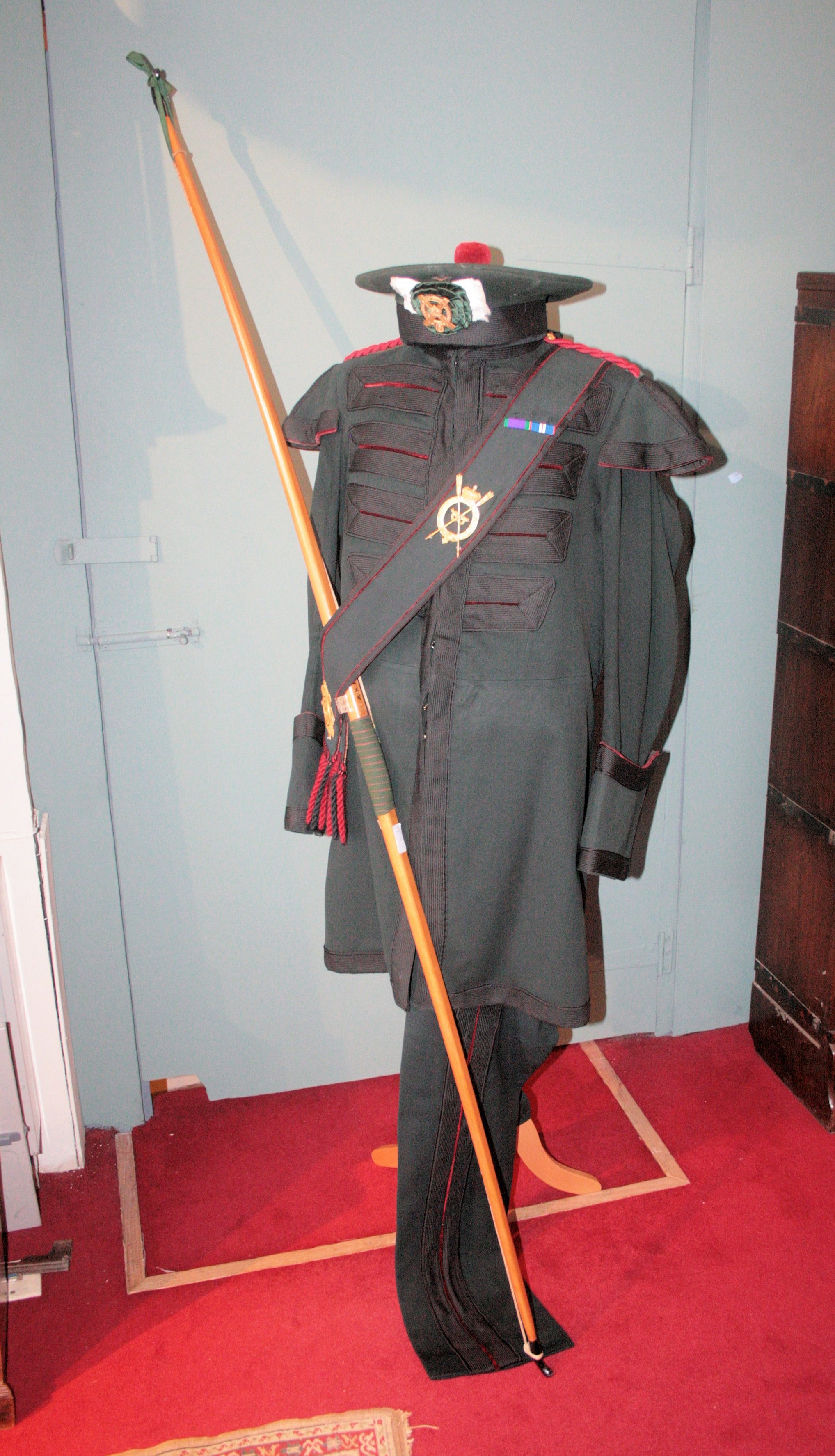 comprising jacket, trousers, cross belt and plate, cloak and fasteners and cap with badge, in traditional green with braiding and gilt buttons ; together with a Royal Archers short sword, bow and arrow