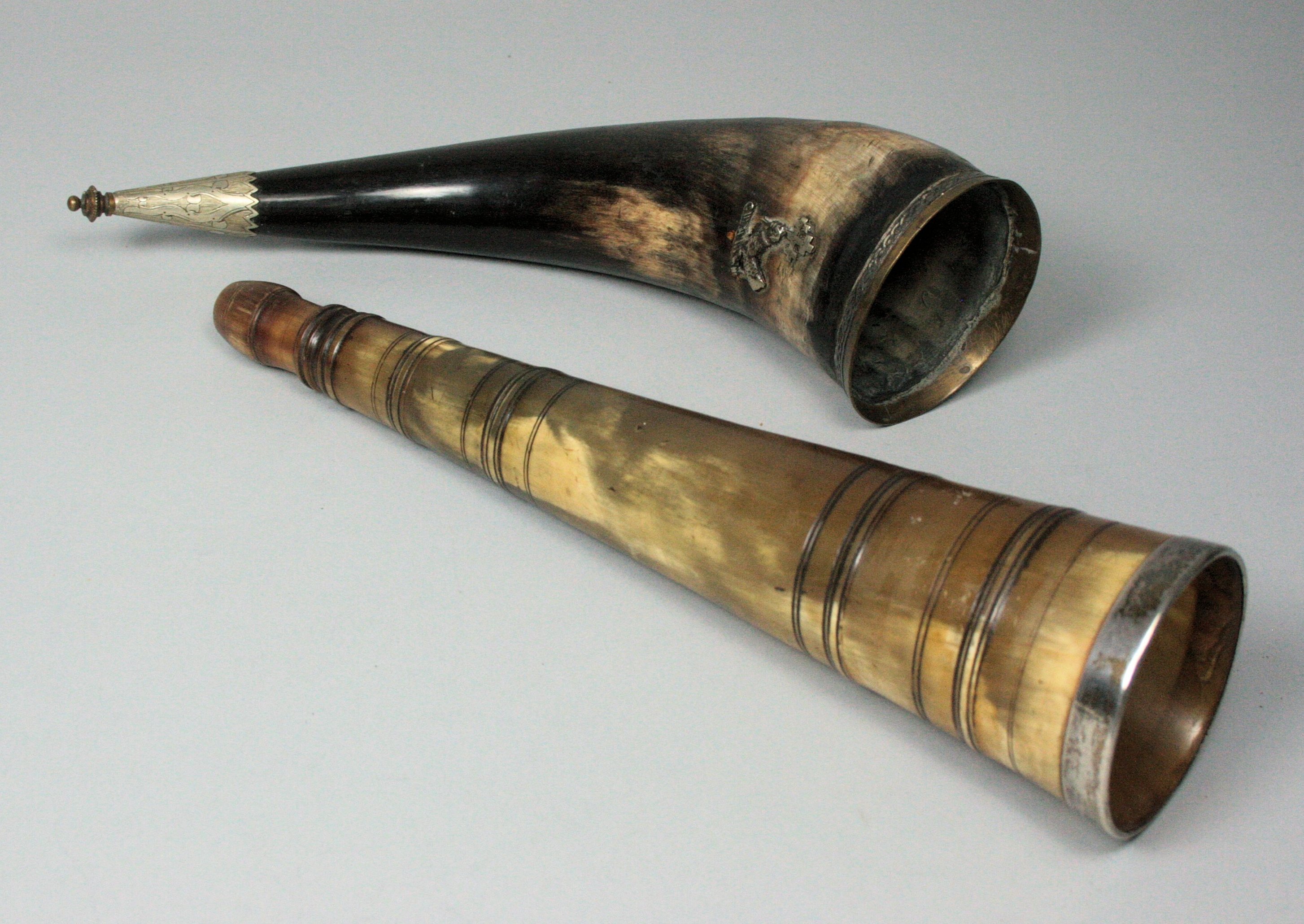 formed from a polished cow horn point with reeded detail and carved whistle to terminal, the rim with simple white metal mount engraved Scub As e; together with a Victorian brass and plated mounted example with applied crest and engraved finial (2)