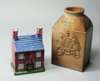 in polychrome decoration in the form of a house , unmarked; together with a salt glazed stoneware tea canister with Royal arms and impressed 'Stewart & Chivas Grocers to the Queen Aberdeen' (2)