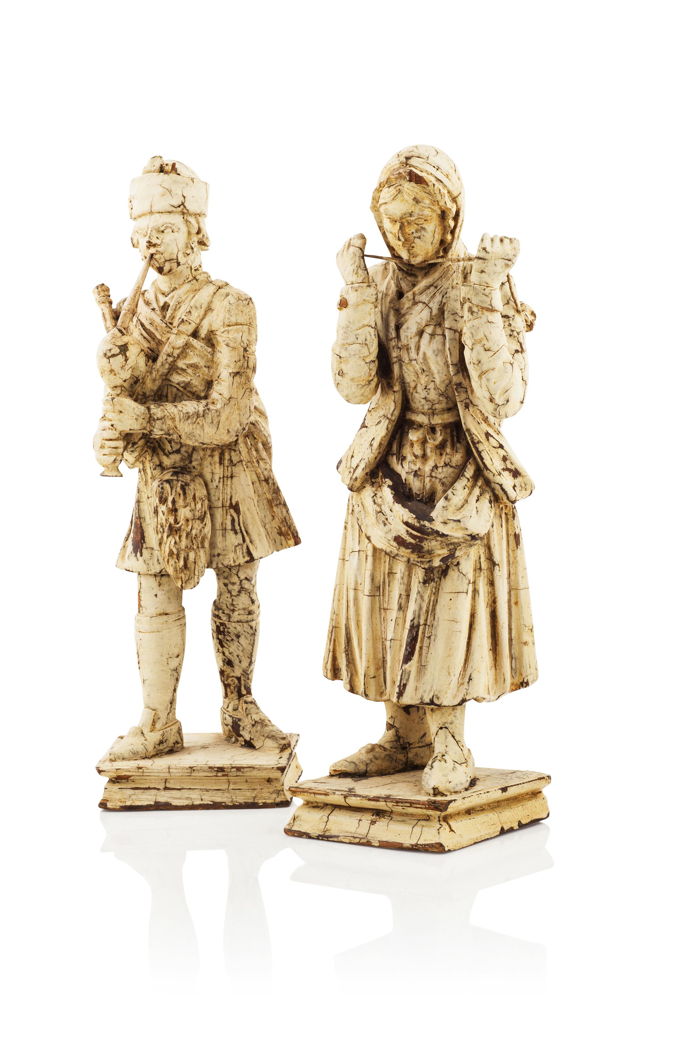 A pair of late 18th early 19th century carved and painted wooden Scottish figures