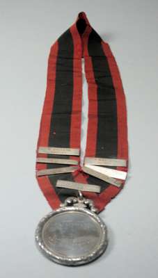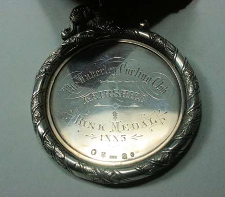 Alexander Gard (probably), Edinburgh 1877 with foliate border and suspenders the obverse engraved 'The Waverly Curling Club Keirsheill Rink Medal 1885' to reverse 'Presented by James Ferguson', suspended from a red and black ribbon with seven engraved winners bars