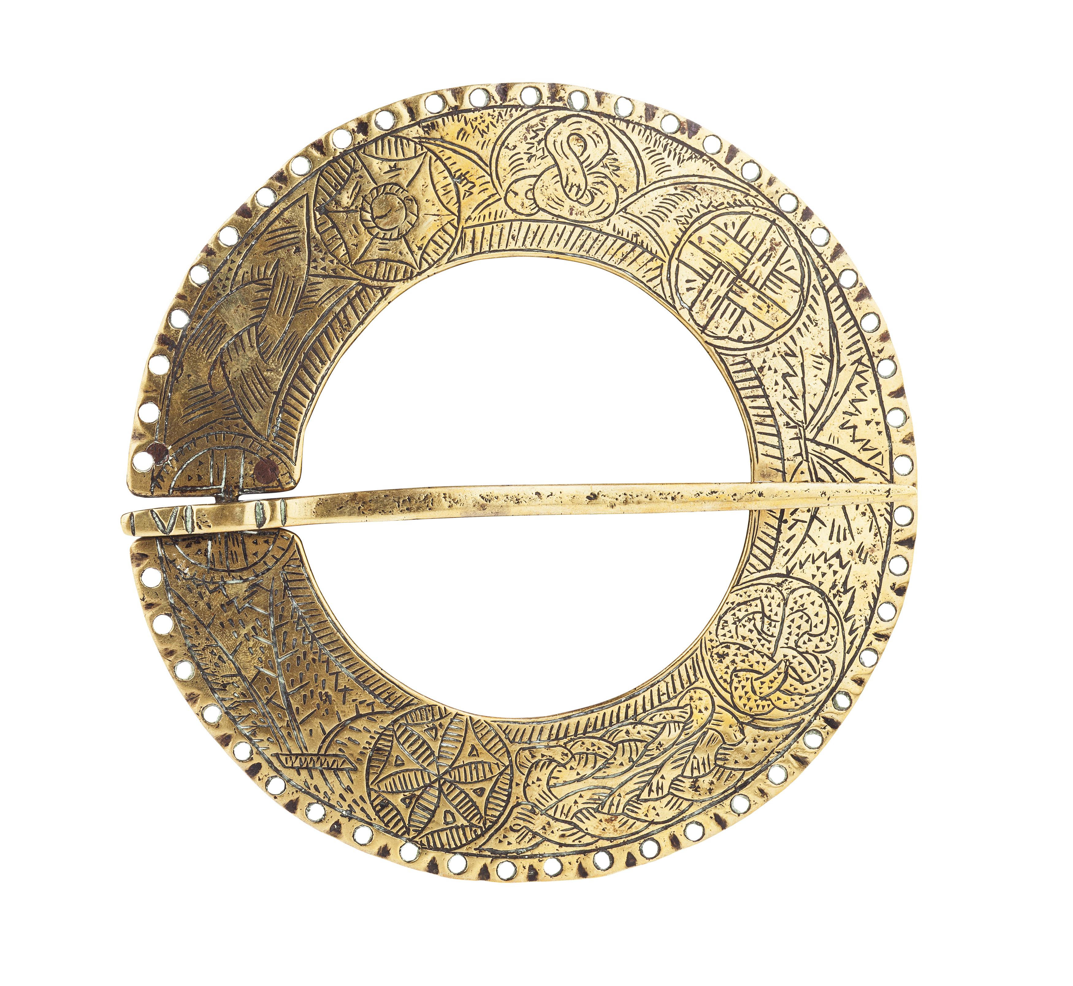 of circular outline with pierced border and engraved celtic knotwork and bosses within, with integral swing pin, with engraved date to reverse '1671'