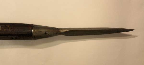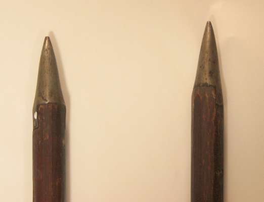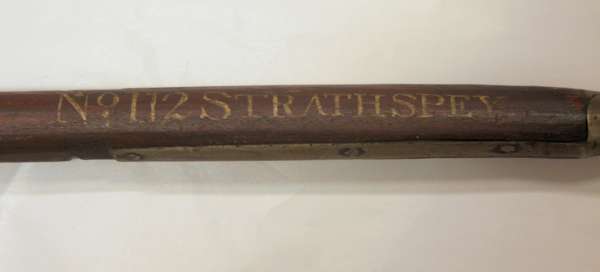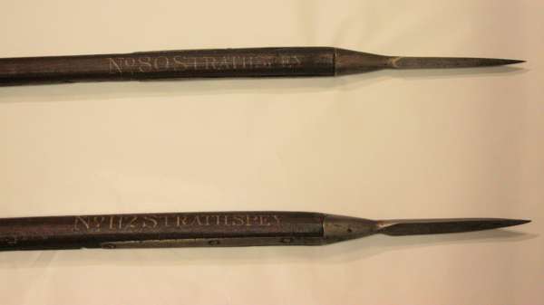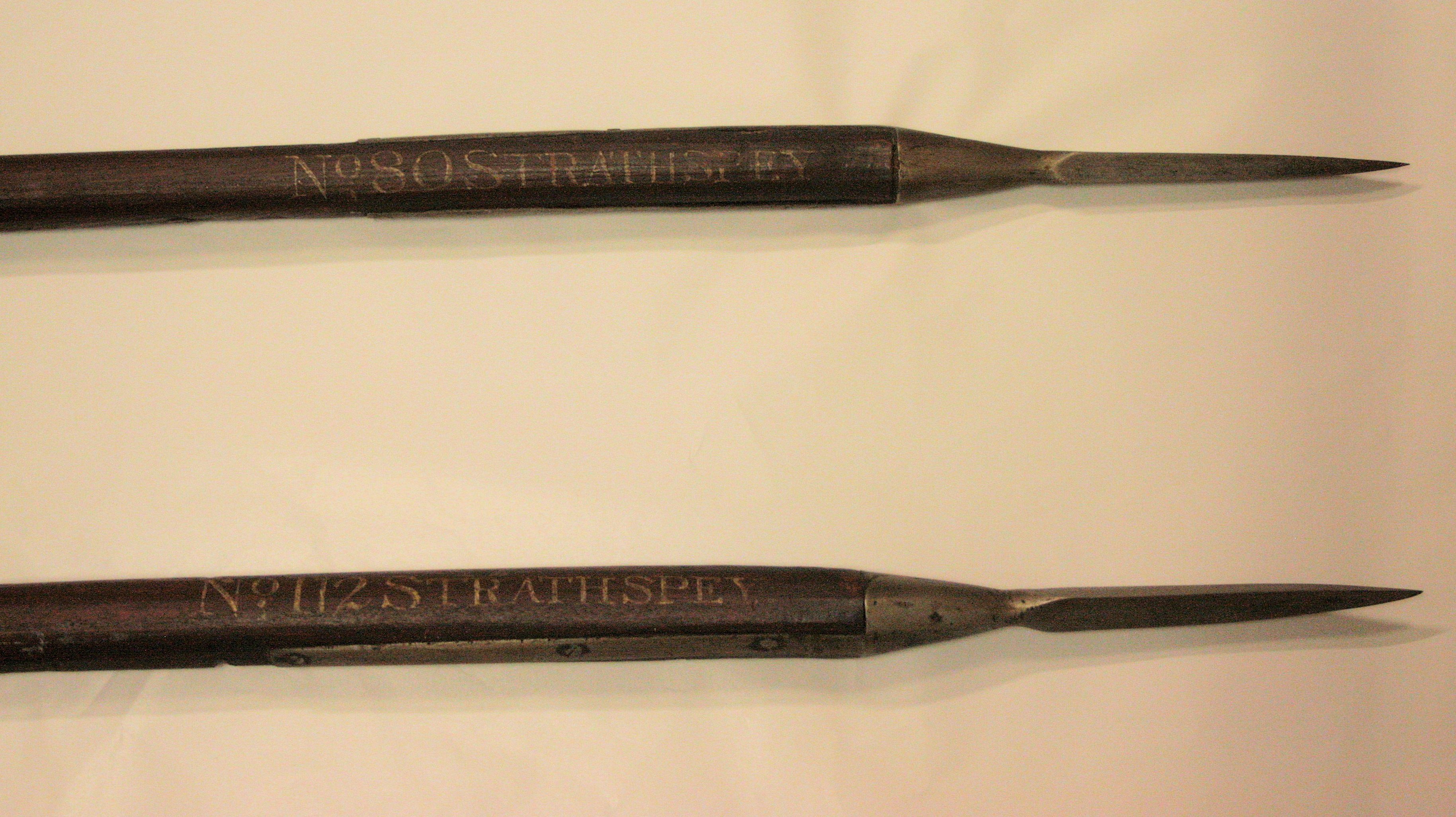 of conventional form with straight wooden shaped with pointed steel mount to base and three side spear point to other, with painted inscription to upper shaft 'No 80 STRATHSPEY' and 'No 112 STRATHSPEY' (2)