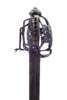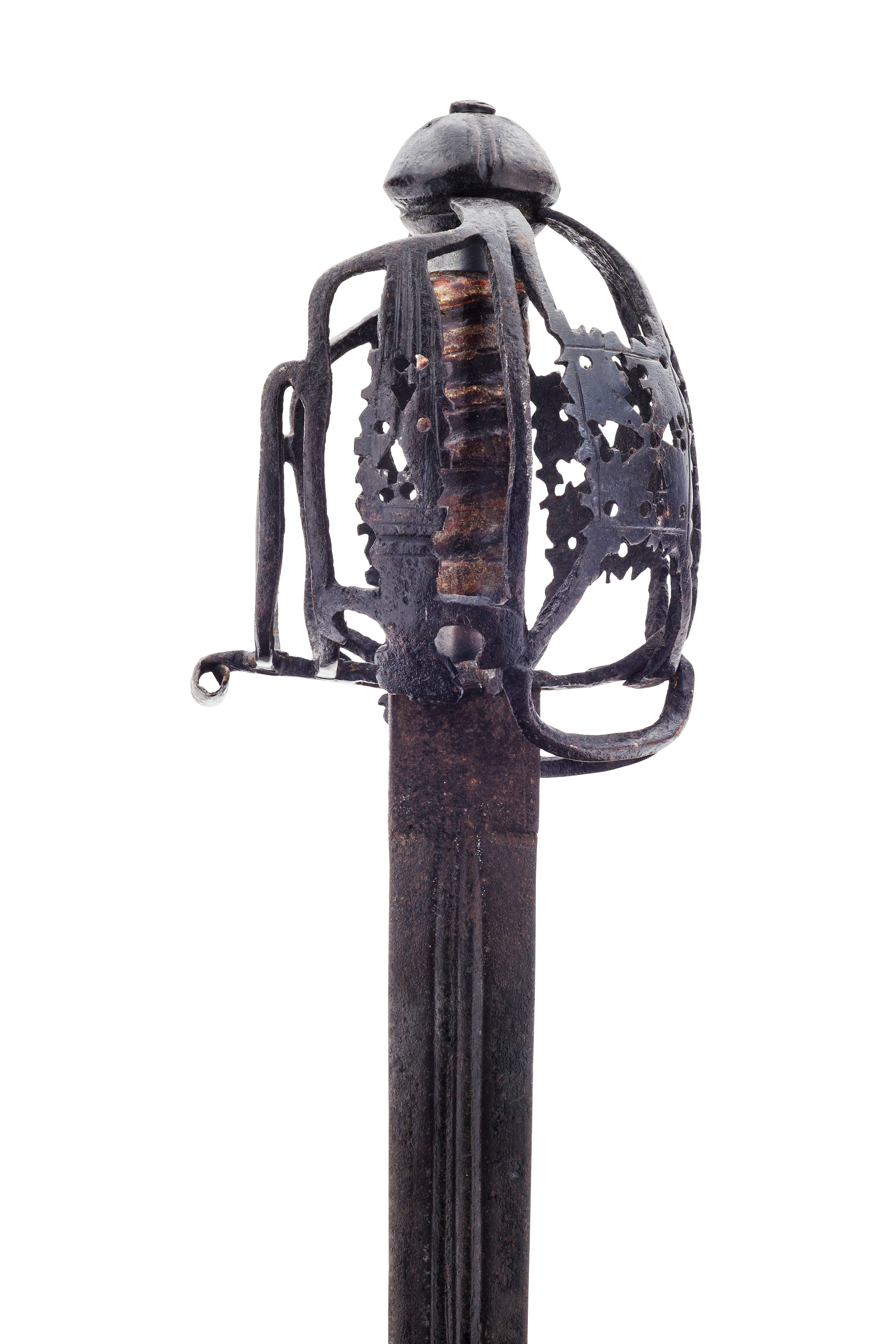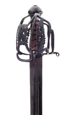 the basket formed of panels and square section bars, the plates are pierced with arrow heads and holes, the side and knuckle plates being multi grooved, a single groove frames each shield, the edges of all plates are decorated with deeply cut merlons. The domed pommel has an equatorial groove into which the arms of the hilt fit and a shallow tang button, with German double edged blade has two fullers of nearly full length and patination