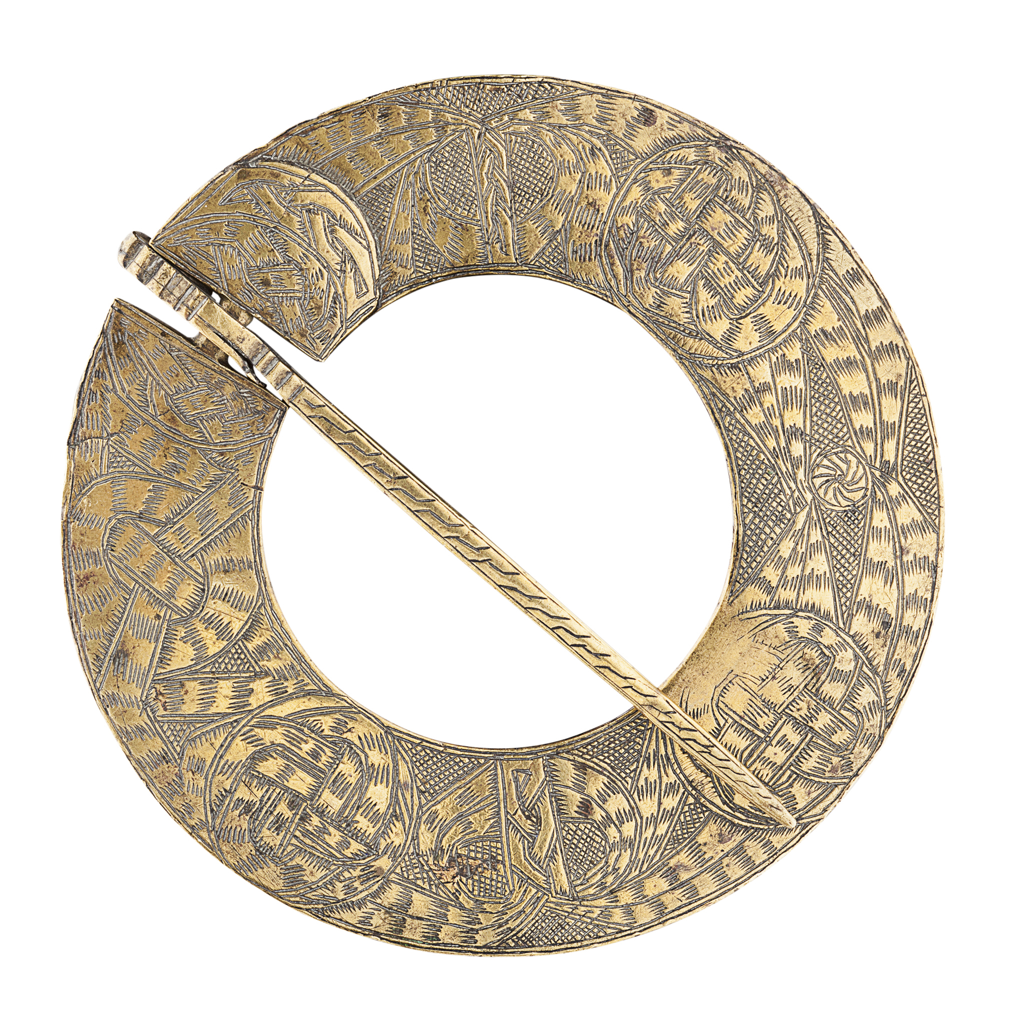 of annular form with intricate engraved knotwork panels and bosses, integral swing pin, with scratch initials 'ID' to reverse