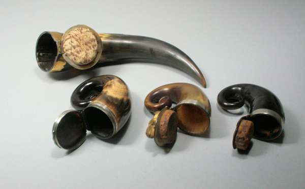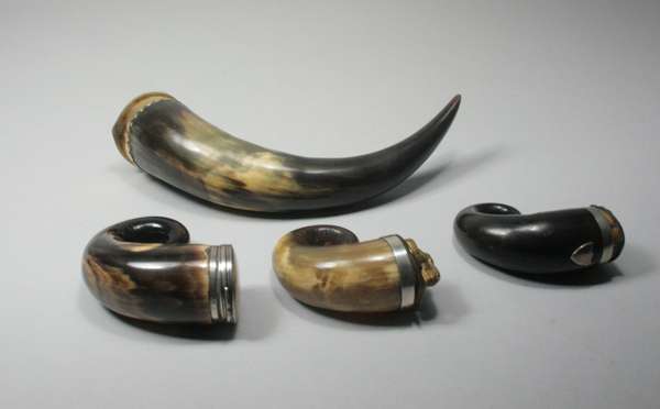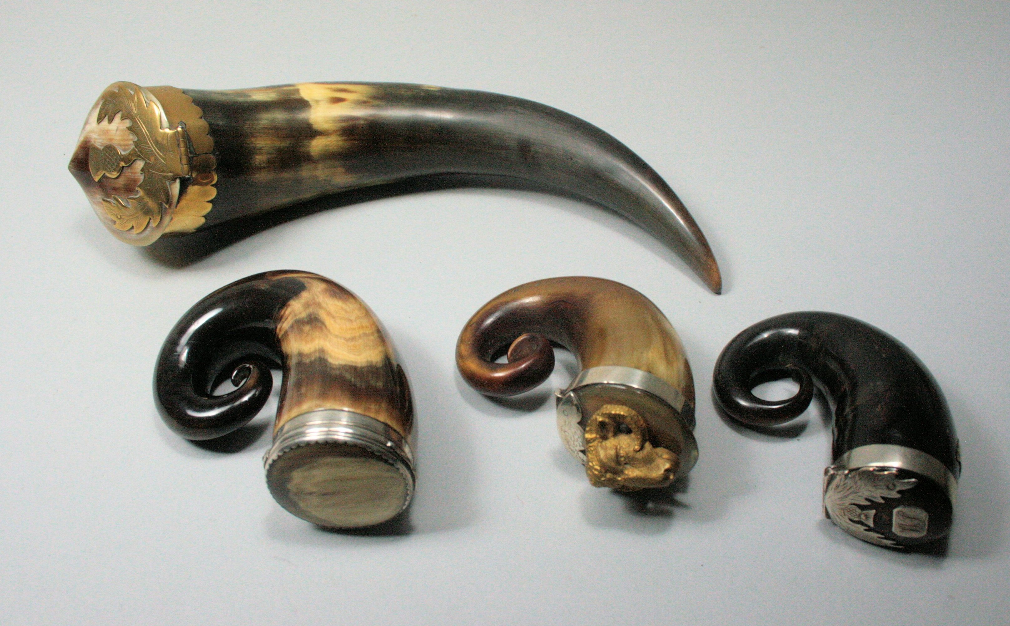 to include a table example with brass mounts and thistle hinge; three curly horn examples, one with thistle hinge, one with simple reeded and scalloped mounts, the other with applied gilt metal ram's head to cover (4)