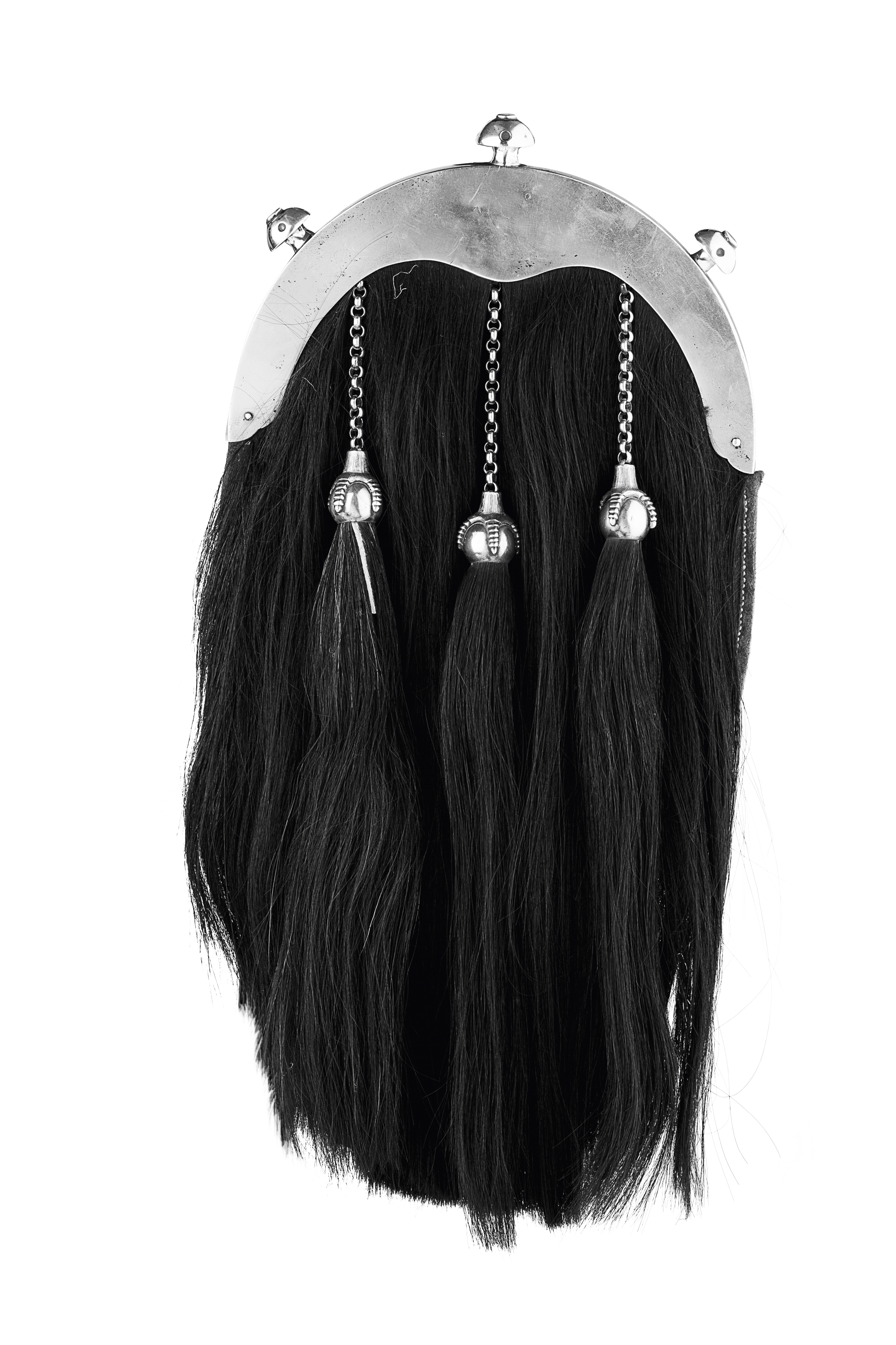 R & H B Kirkwood, the plain arched cantle with three beaded finials, black horse-hair body with three horse-hair tassels, claw and ball bells