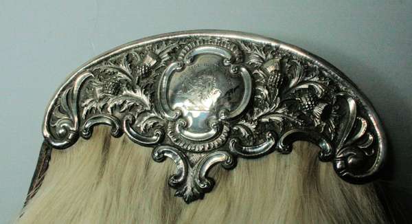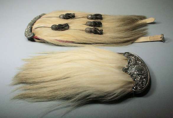 one with arched white metal cantle with embossed thistles and engraved crest, with white horse hair and red leather pouch; together with another larger example with arched thistle cantle and white horse hair body, with five silver bullion tassels (2)