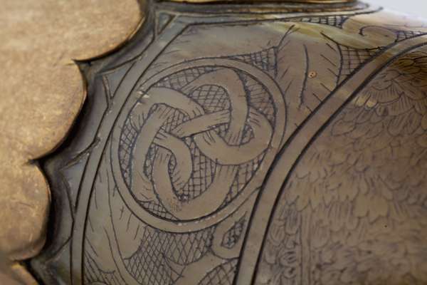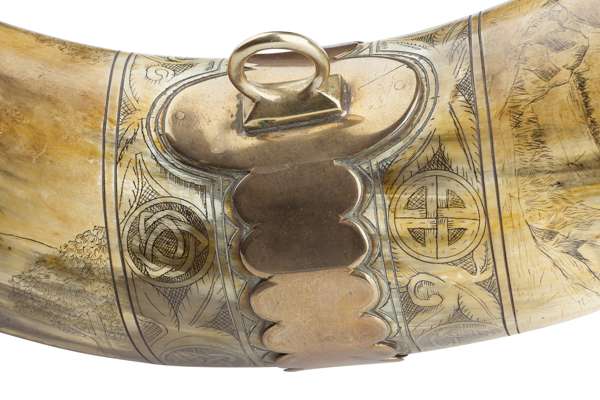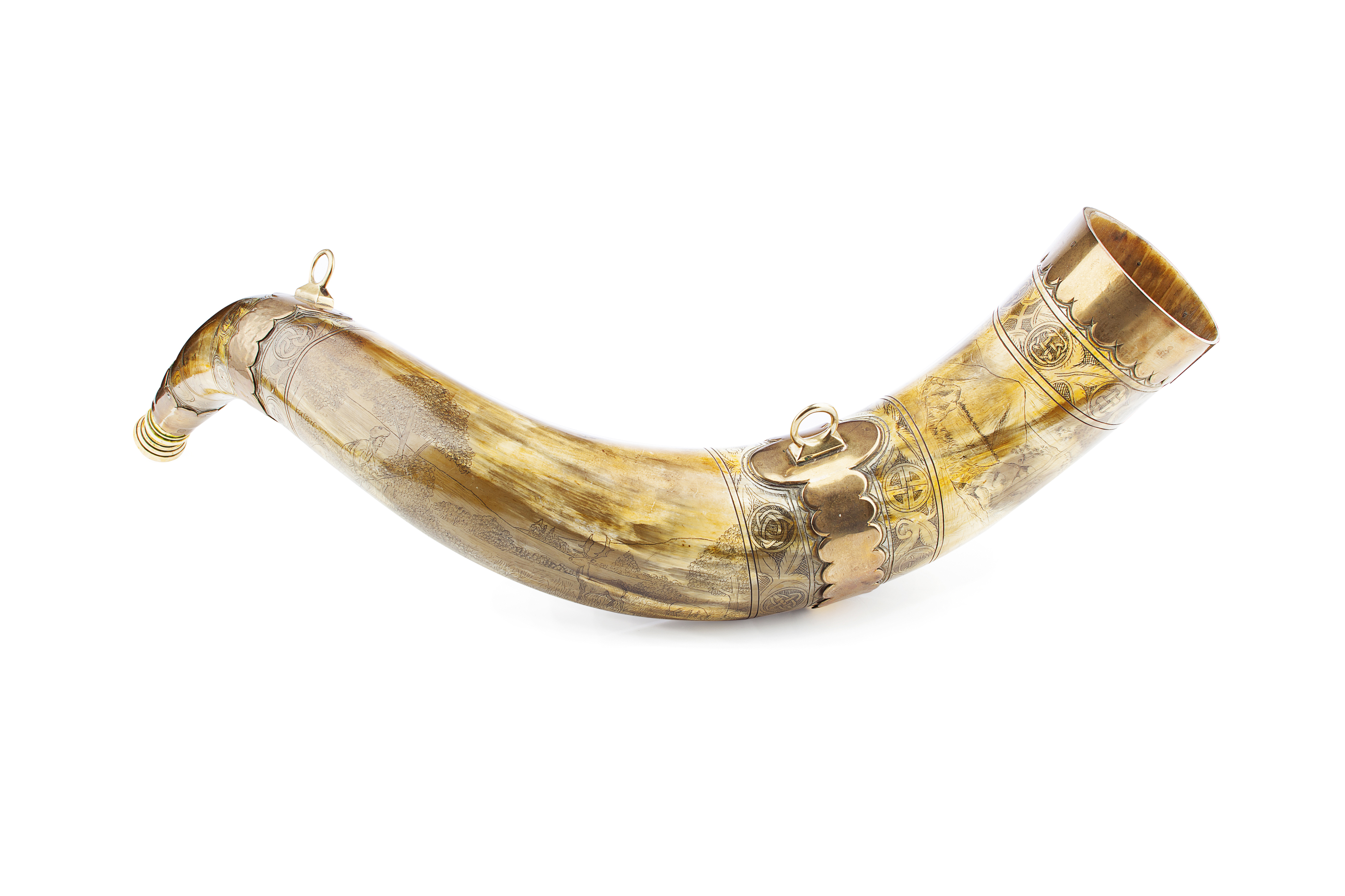 the polished bull horn with scalloped brass mounts and finely engraved Celtic borders, each panel engraved with a different hunting scene with stags and dogs in landscapes