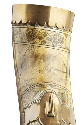 A large brass mounted and finely engraved bull horn