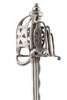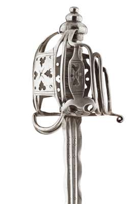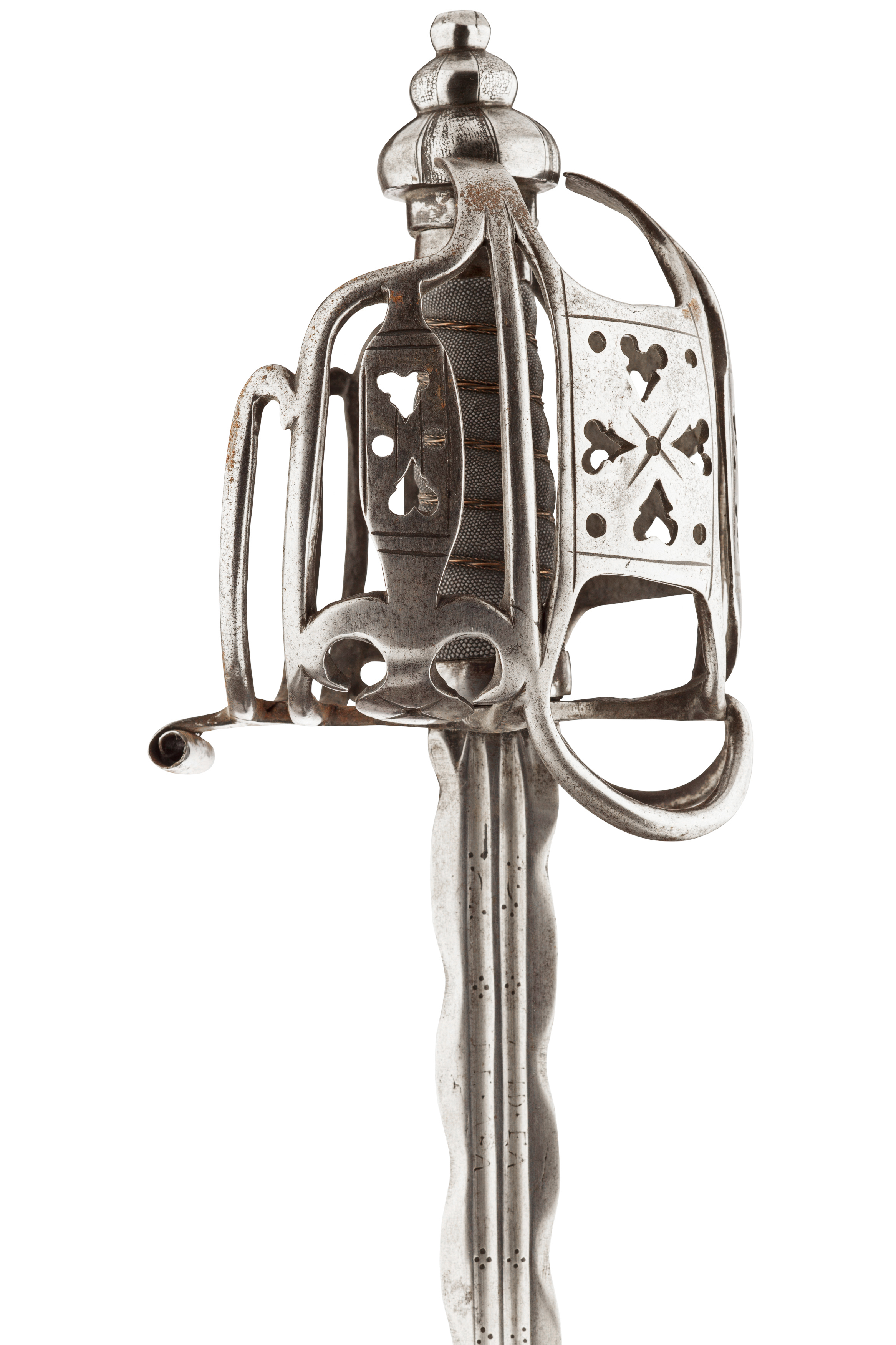 the hilt of round section bars, elongated panels pierced with hearts, triple bun pommel, fish-skin grip bound with copper wire and with two broad ferrules, small curled wrist guard, double edged wavy blade with two short fullers struck ANDREA FERRA.