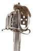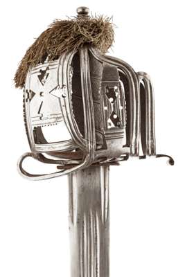the basket formed of flat section bars with centre grooves, side guards with hearts pierced on each plate, with horseman's loop on one inner panel, the pommel with fringe, cut with grooves, the black dogfish skin grip bound with a single twist of brass wire, the blade with three fullers struck with ANDREA FERRA.