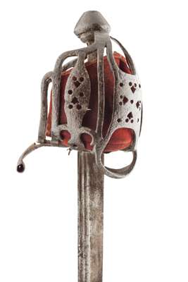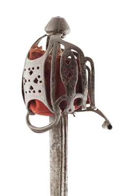 the basket formed of flat section bars with grooves, side guards with hearts pierced on each plate, wide wrist guard, traces of japanning, pommel cut with grooves the grip missing, the blade with long fuller struck ANDRA FERARRA.