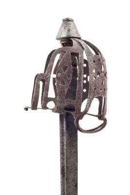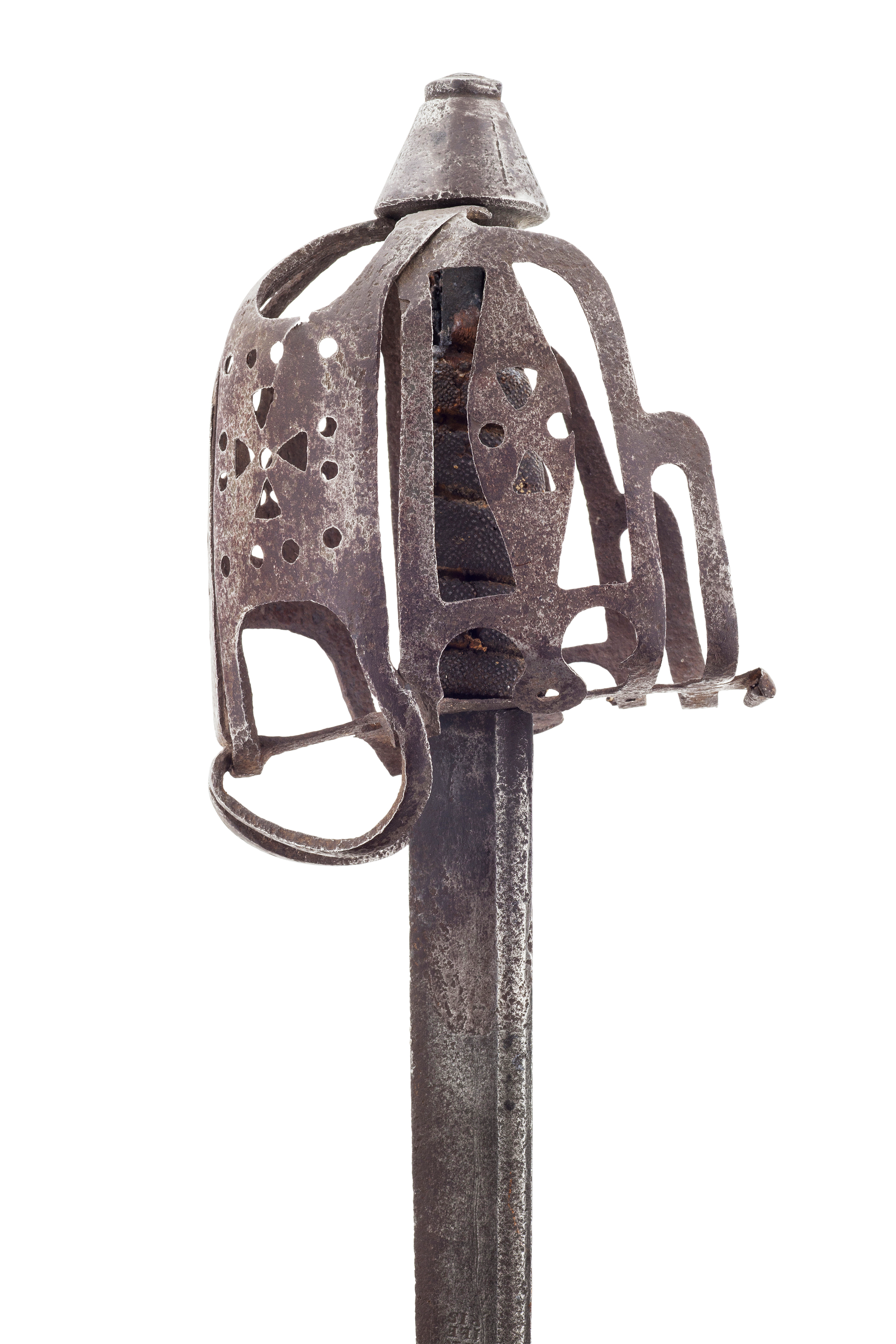 the basket of corroded flattened iron forming the basket conical pommel with feint engraved numerals grip of fish-skin missing binding the single edge blade struck with crowned GR surmounting initials ILS RLS