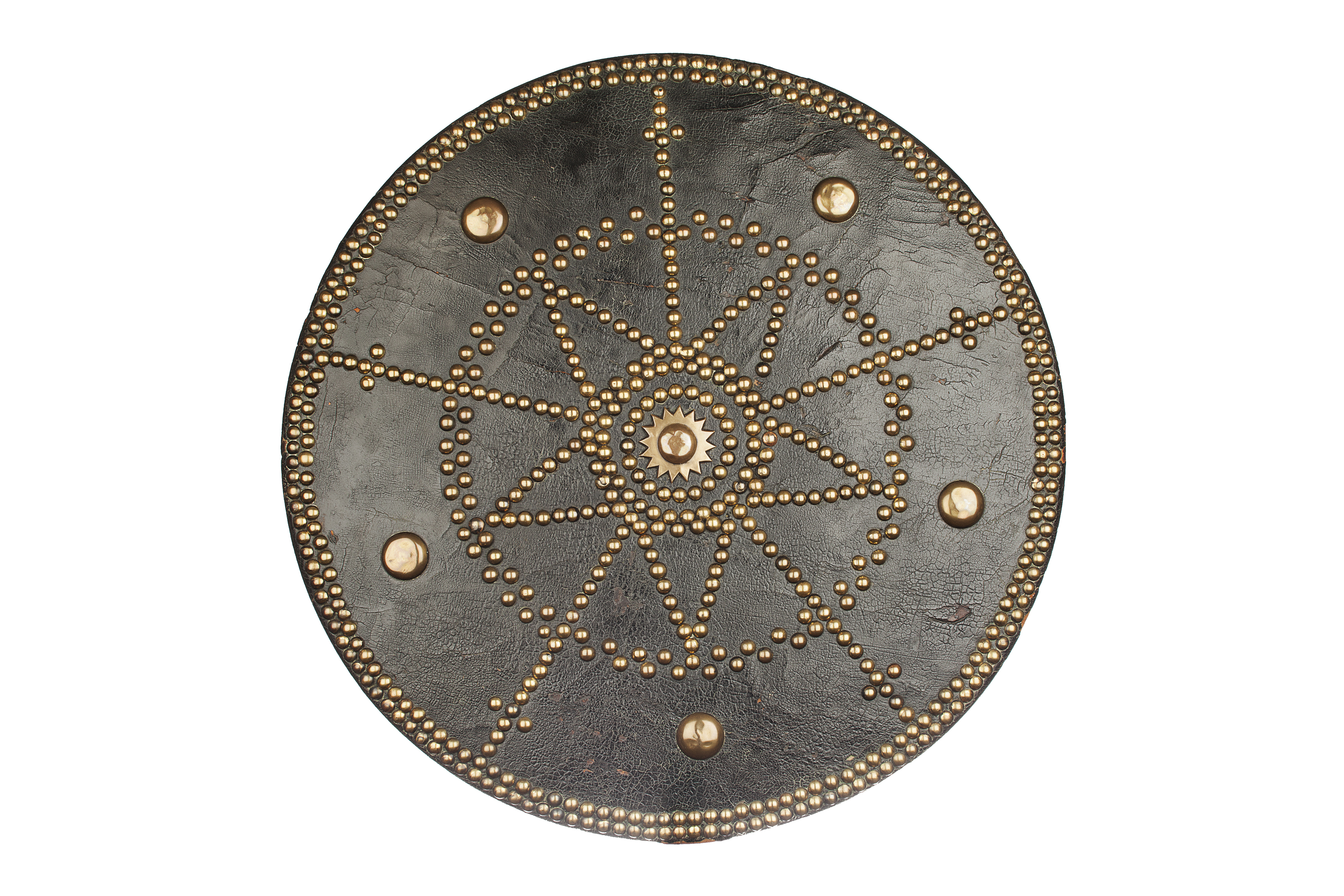of traditional form, leather covered and studded with round topped brass studs formed as a large star intersected with large domed brass studs (some minor damage to leather) the reverse covered in soft leather with replacement hand and arm holds