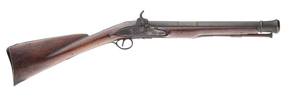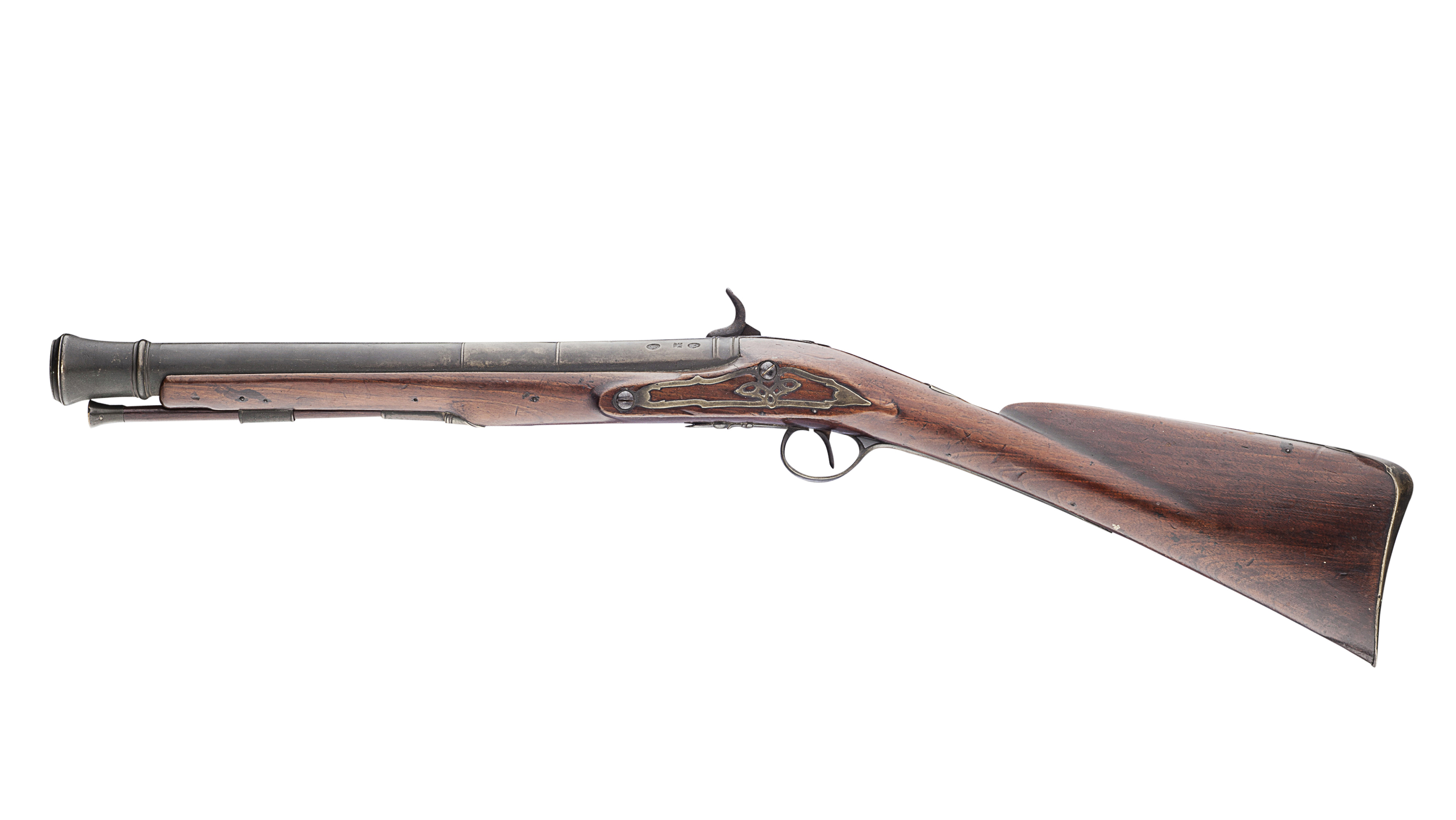 the lock signed by John Mann (of Main Street, Gorbals), active 1782 - 1827, with flared brass barrel with proof marks for Robert Garrod circa 1722, set in a well figured wooden stock with brass mounts