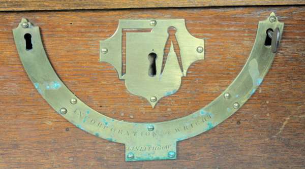 with carved makers mark WW 1743, to inner edge, the oak rectangular box with iron handle to cover and brass handles and binding to side, the front of the box with three locks one with decorative plate with square and compass, the others joined by arched brass plaque inscribed 'Incorporation of Wrights Linlithgow'