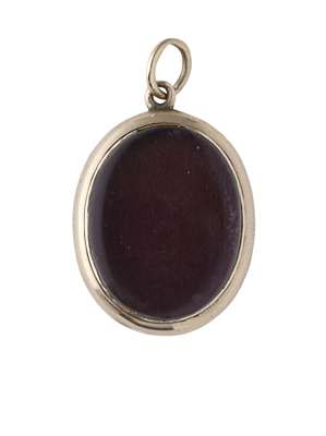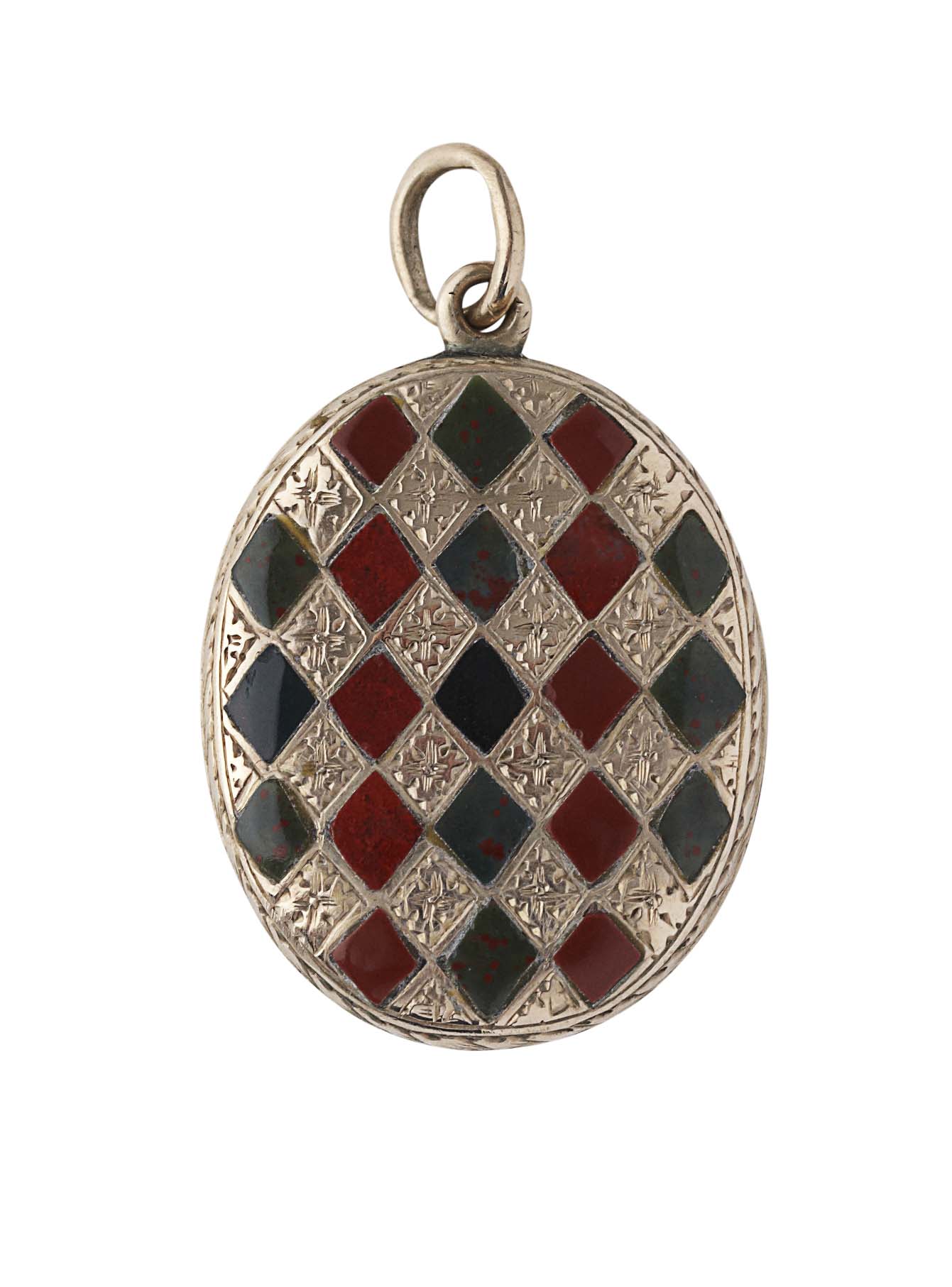 of oval outline, modelled in unmarked yellow metal with engraved and agate set chequered design, the reverse with glazed panel