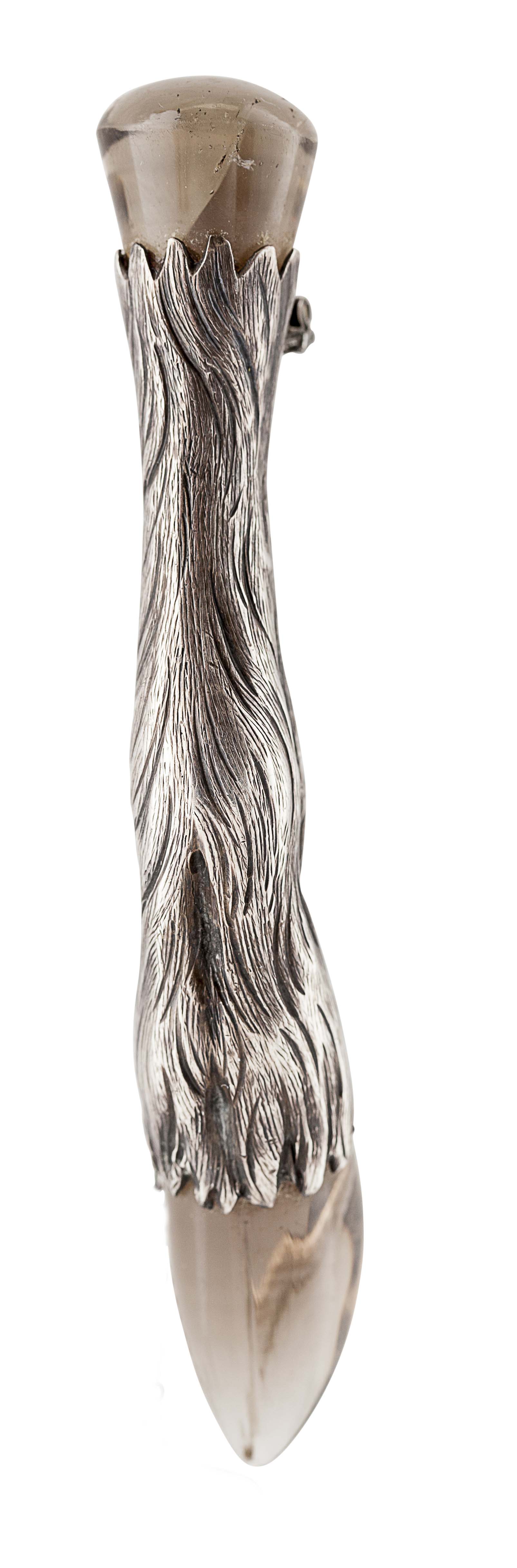 unmarked, naturalistically formed as a deer's hoof with finely textured silver mount with polished smoky quartz to hoof and terminal