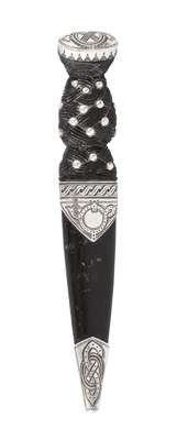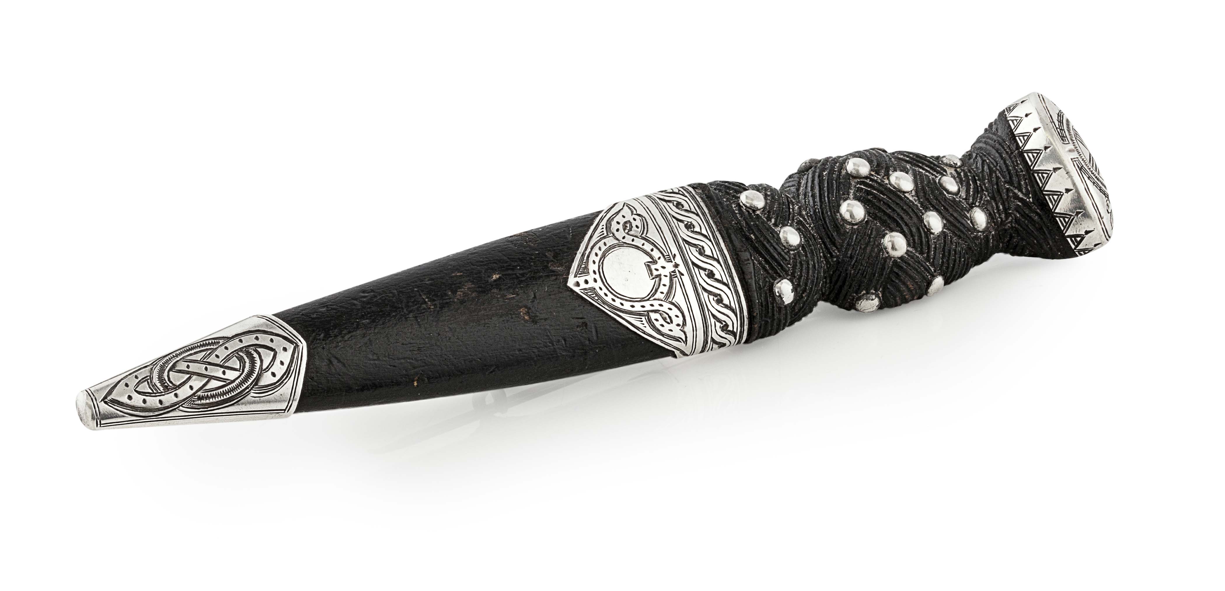 unmarked, the carved wooden handle with interlace with studded detail, with engraved pommel cap, the leather covered scabbard with engraved Celtic style mounts