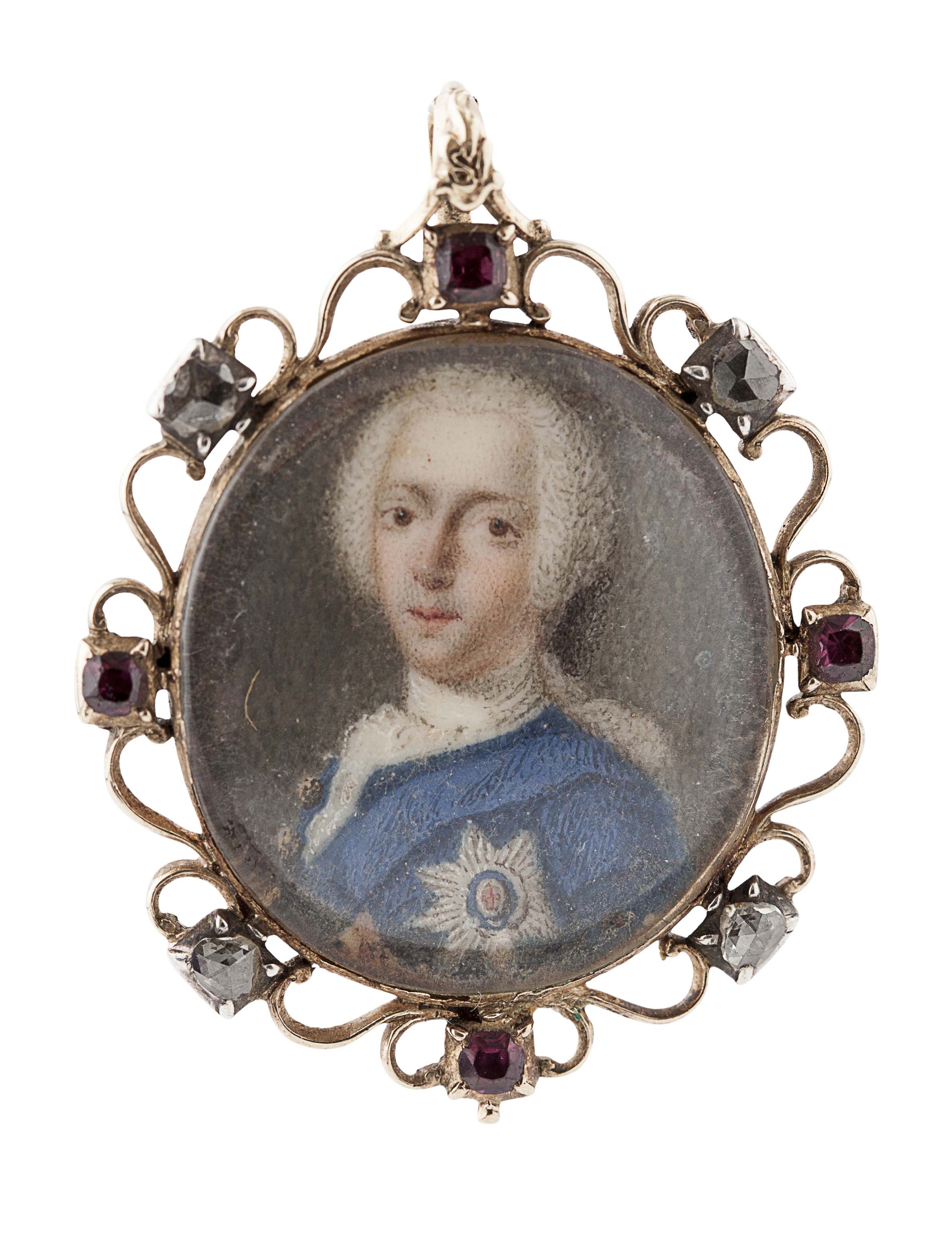 English school, oval portrait, watercolour on ivory, depicting Prince Charles Edward Stuart facing left with blue coast and sash and breast badge, within gold frame with scroll mounts set with rubies and diamonds, the reverse set with agate