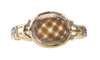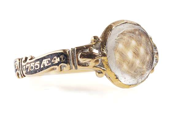 the oval head formed as a double sided glass panel enclosing woven hair, the black enamel shank with gold detail inscribed 'DUNCAN MCGROUDER ob. 16th SEP 1755 AE 41'