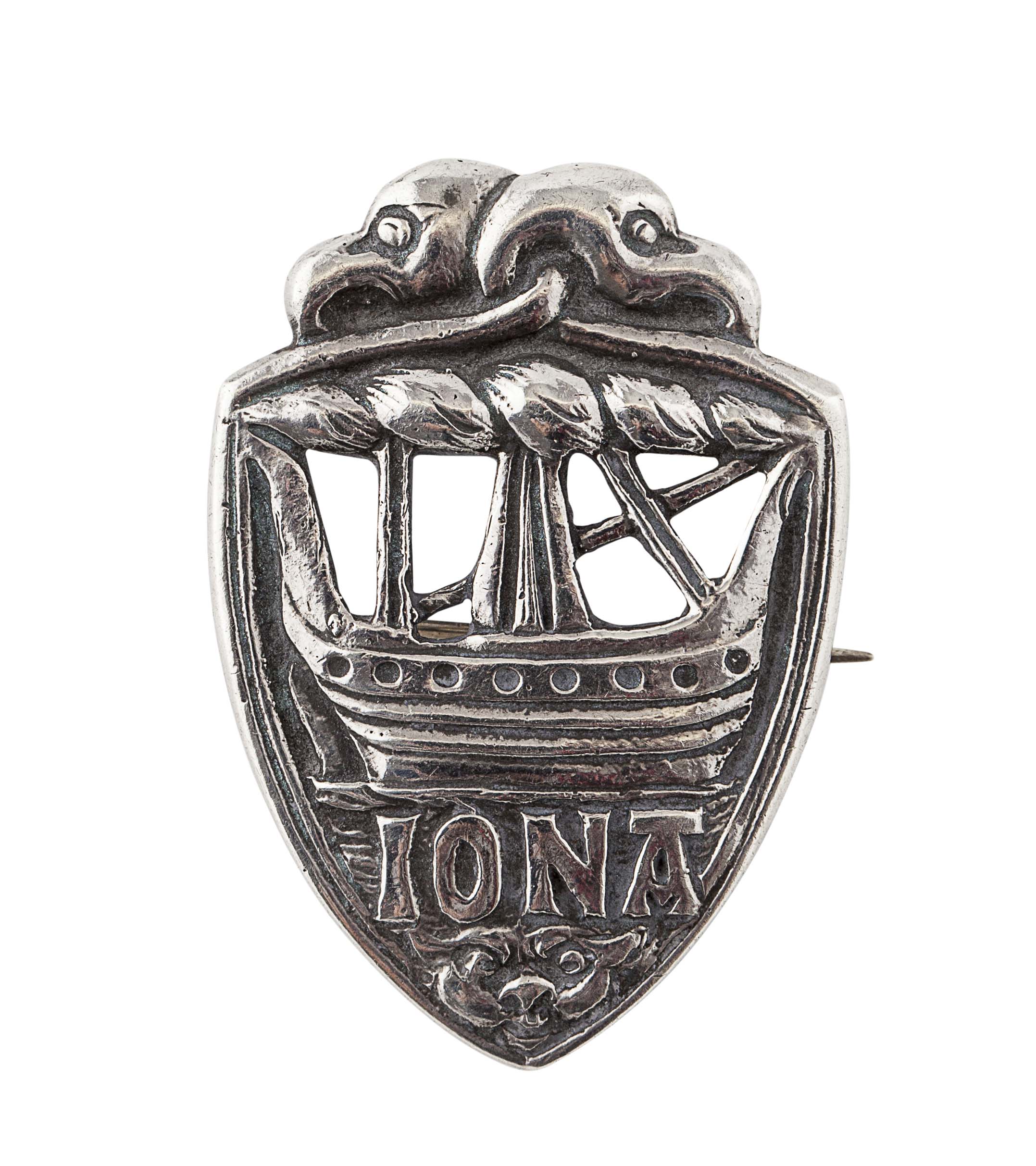 Alexander Ritchie, marked Saunders & Sheppard, Chester 1909, AR, IONA, of shield shape with Iona galleon above IONA, surrounded by intertwined birds