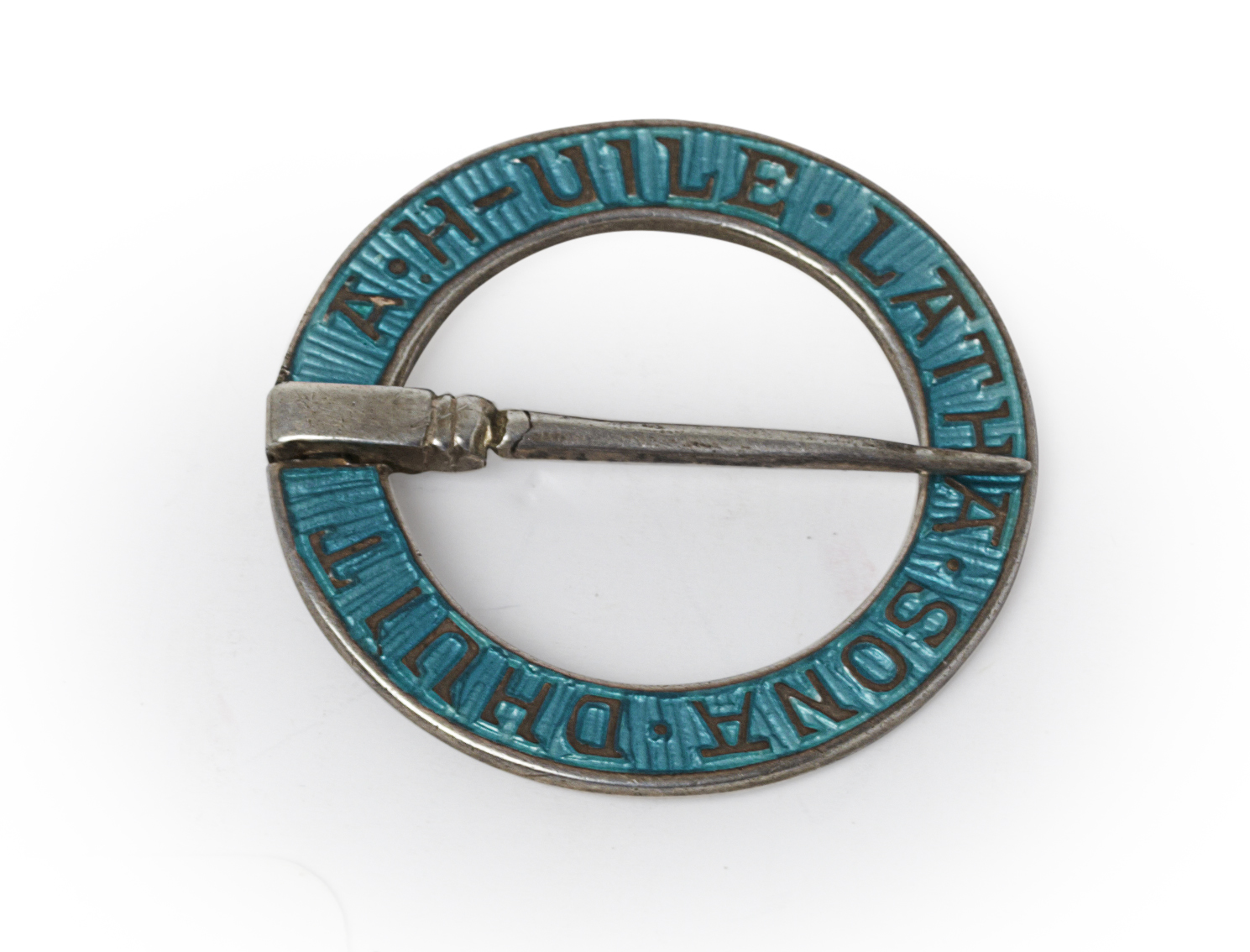 Alexander Ritchie, marked AR, IONA, ICA, Birmingham 1939, of simple annular form with Gaelic motto turquoise enamel, with integral swing pin