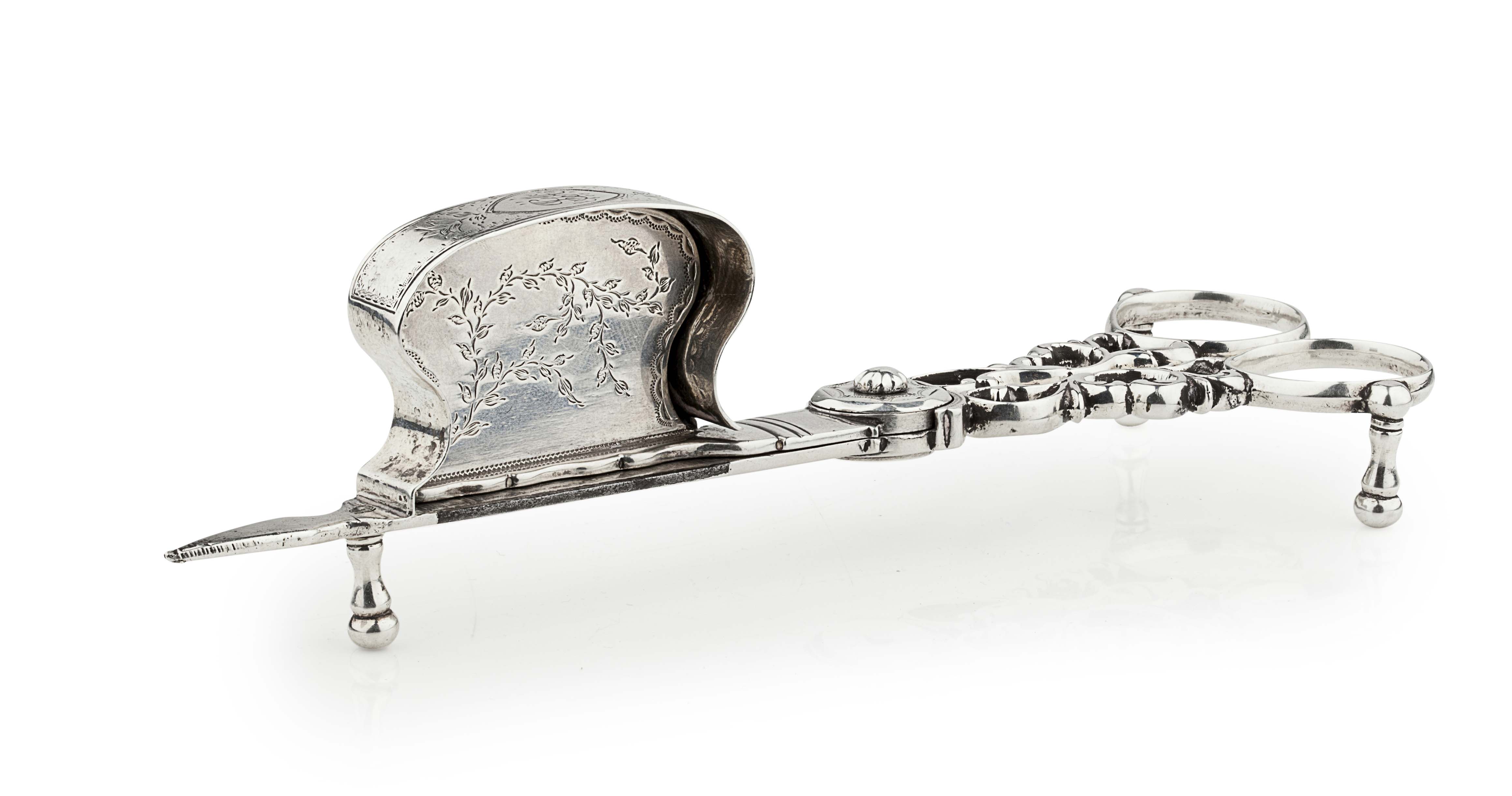 John Argo, of typical scissor action form, the cast open scroll handles to hinged section with box snuffer and steel balance, the snuffer section with bright cut border and trailing foliage