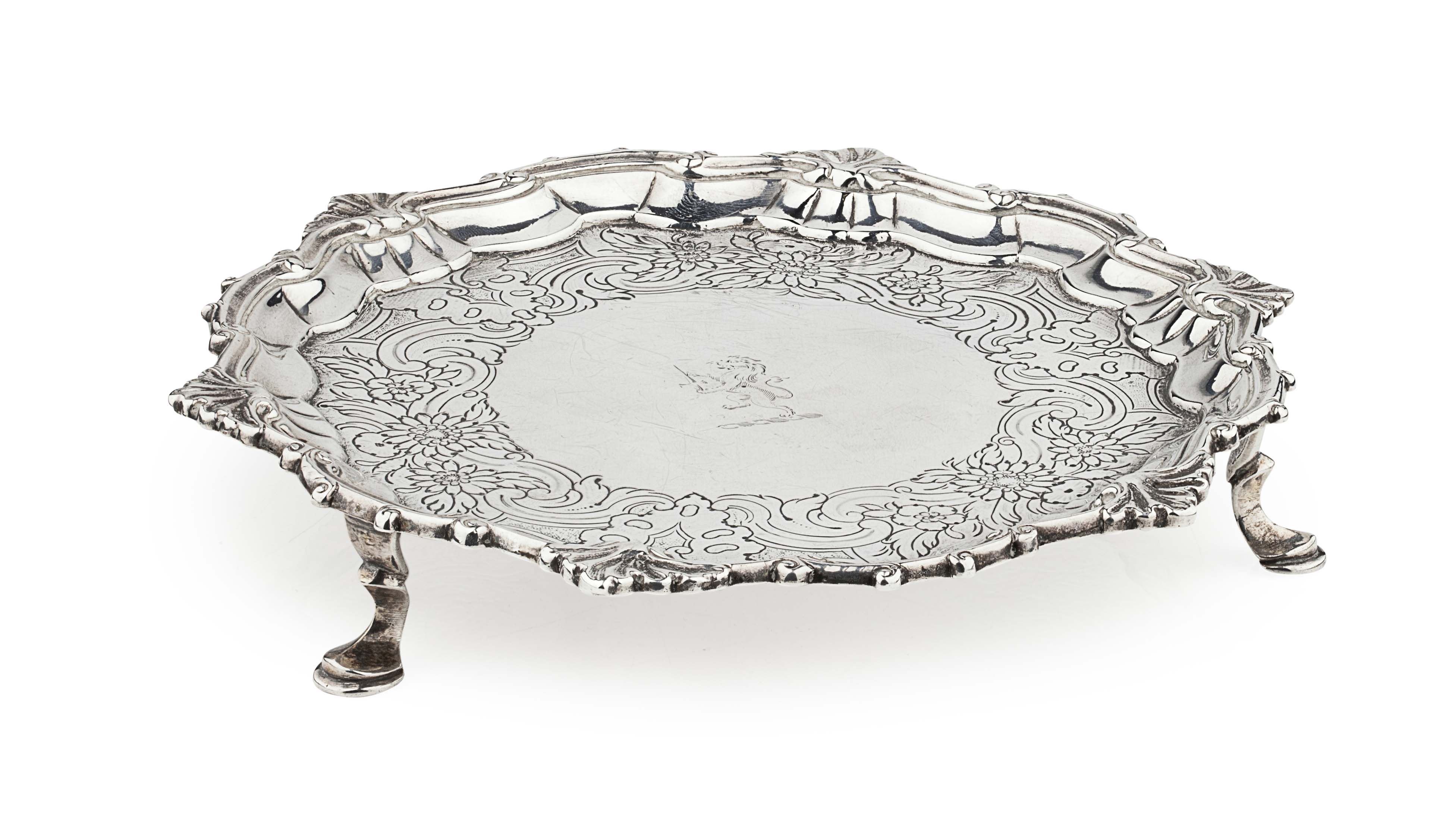 Coline Allan, marked; CA, ABD, of shaped circular outline, scroll and shell border, the central flat chased with rococo scroll, acanthus and displayed floral panels, crest engraved to centre, raised on three hoof feet, the under-side engraved with scratch weight '10:3'
