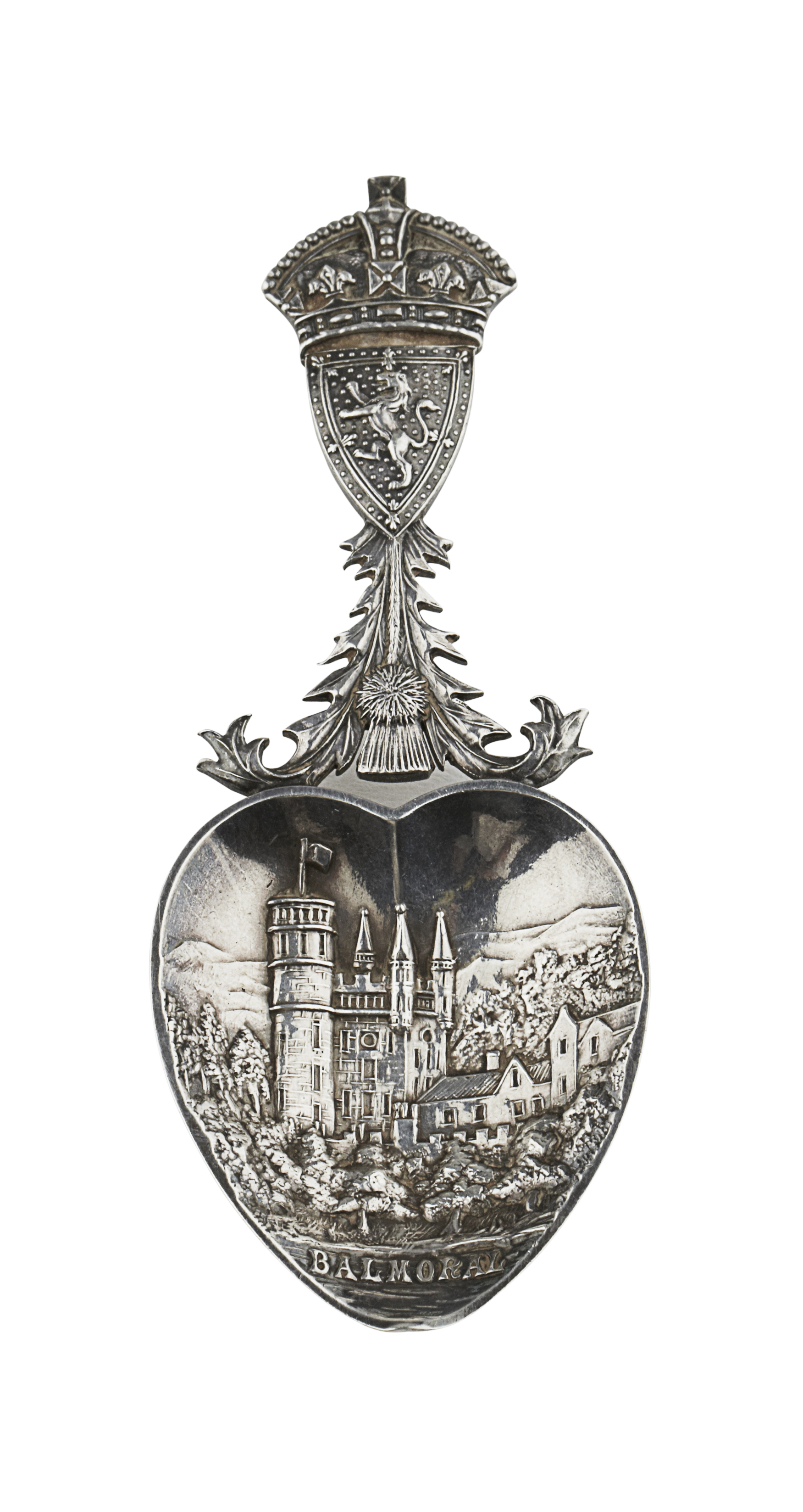 William James Fraser, marked W.J.F, silver, of typical form, with armorial shield handle and thistle stem, heart shaped bowl with named view of Balmoral Castle