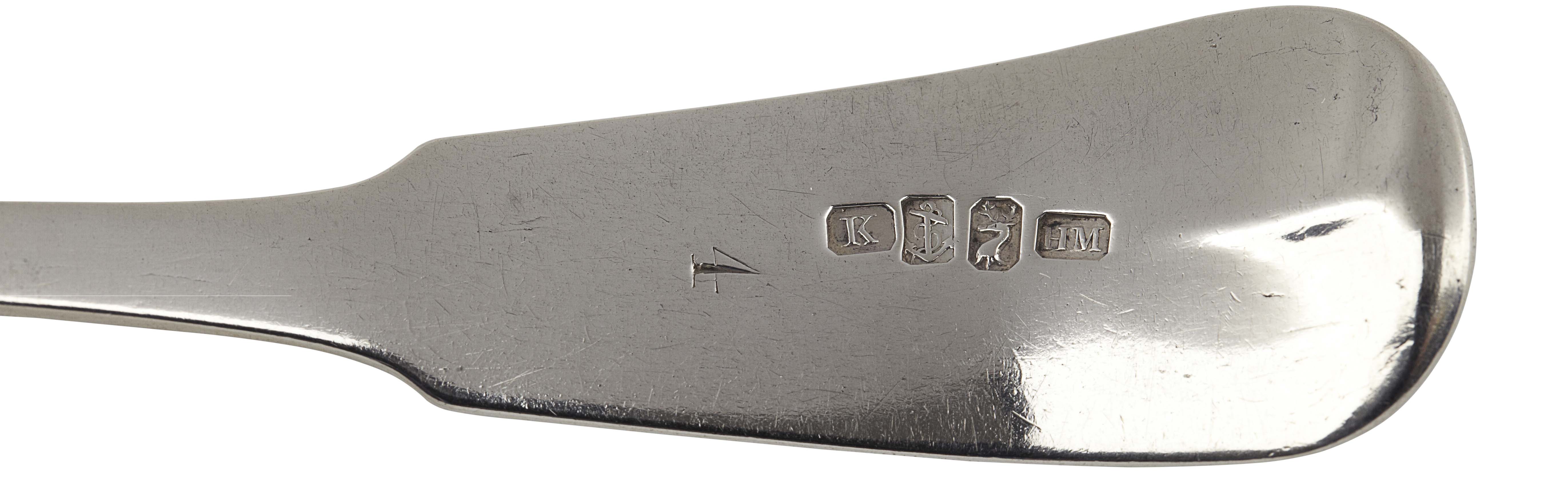 Henry Mouncie, marked K, anchor, stag, HM, of Fiddle pattern with engraved initial 'P' to terminal