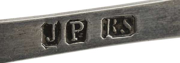 J Pozzi and R Stewart, marked J, P, RS to one arm, ELn to the other, of Fiddle pattern with plain bowls