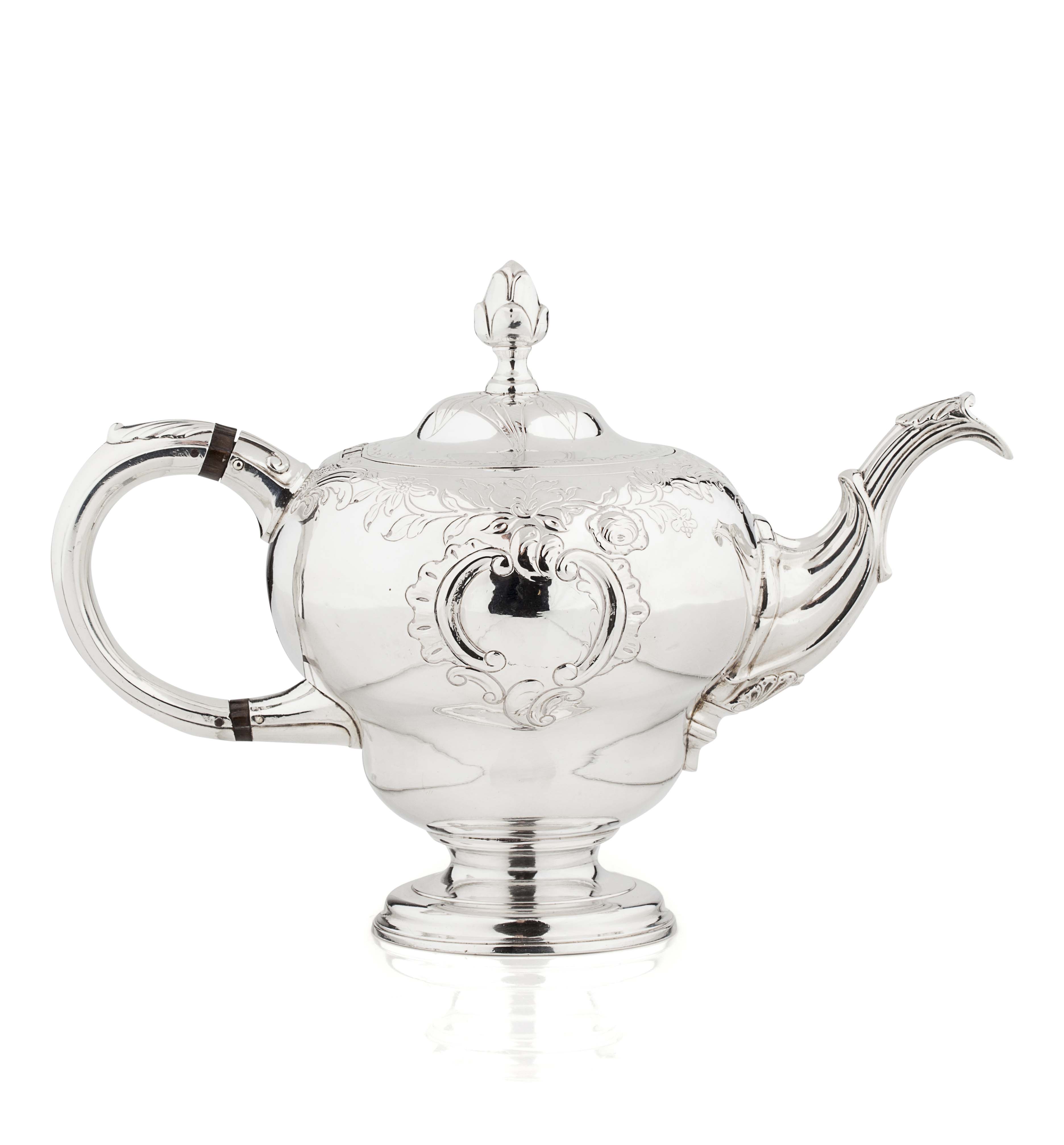 Adam Graham, marked AG, town mark, AG, town mark, of inverted pear shape with chased floral and scroll border and vacant cartouches, the hinged cover similarly decorated with bud finial, C scroll handle with acanthus thumbpiece, with short fluted curved spout