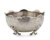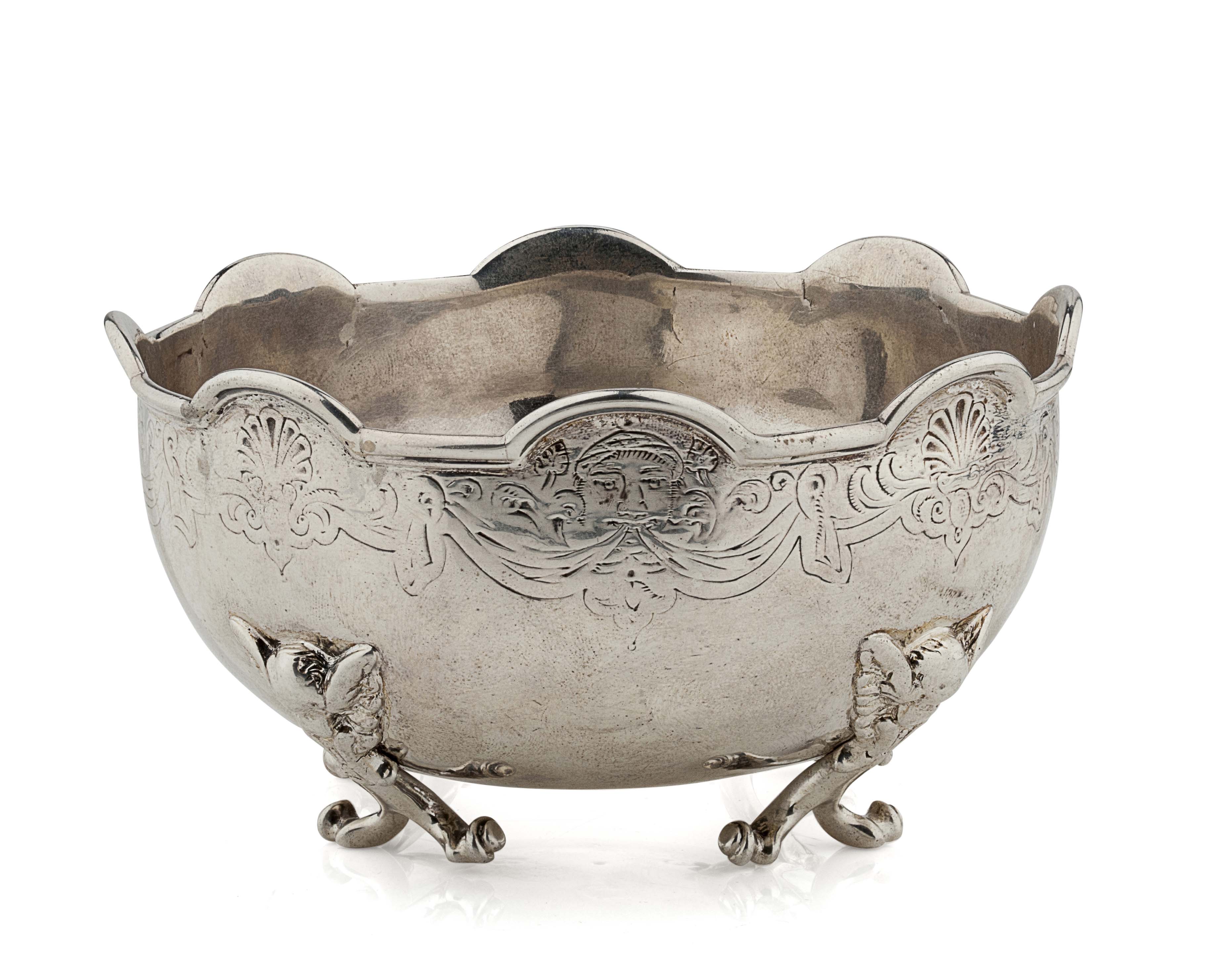 Robert Luke, marked; RL, town marks, RL, S, the hemispherical bowl with scalloped moulded rim and flat chased rococo shell, swag and mask border, raised on three winged putti and scroll supports